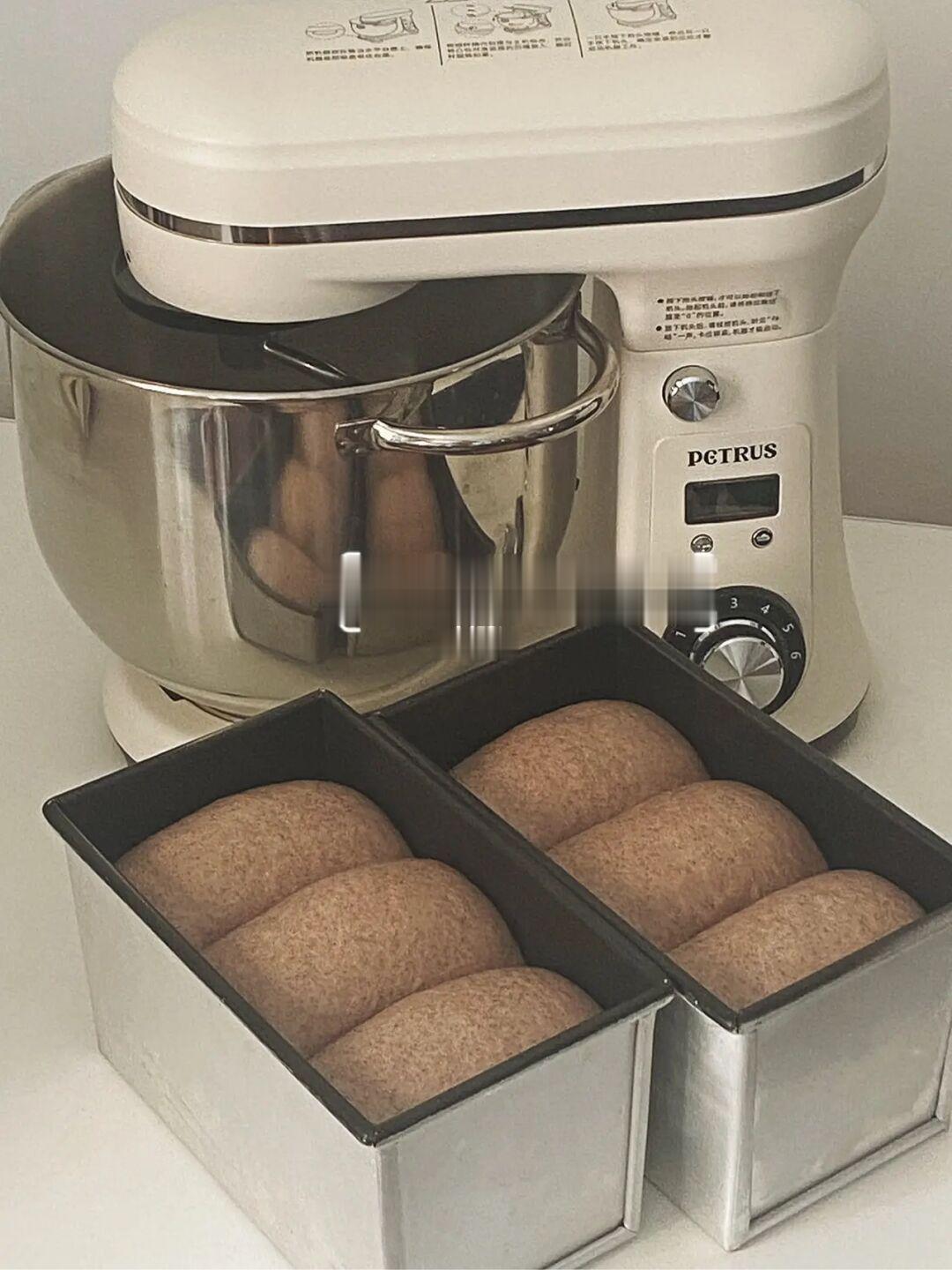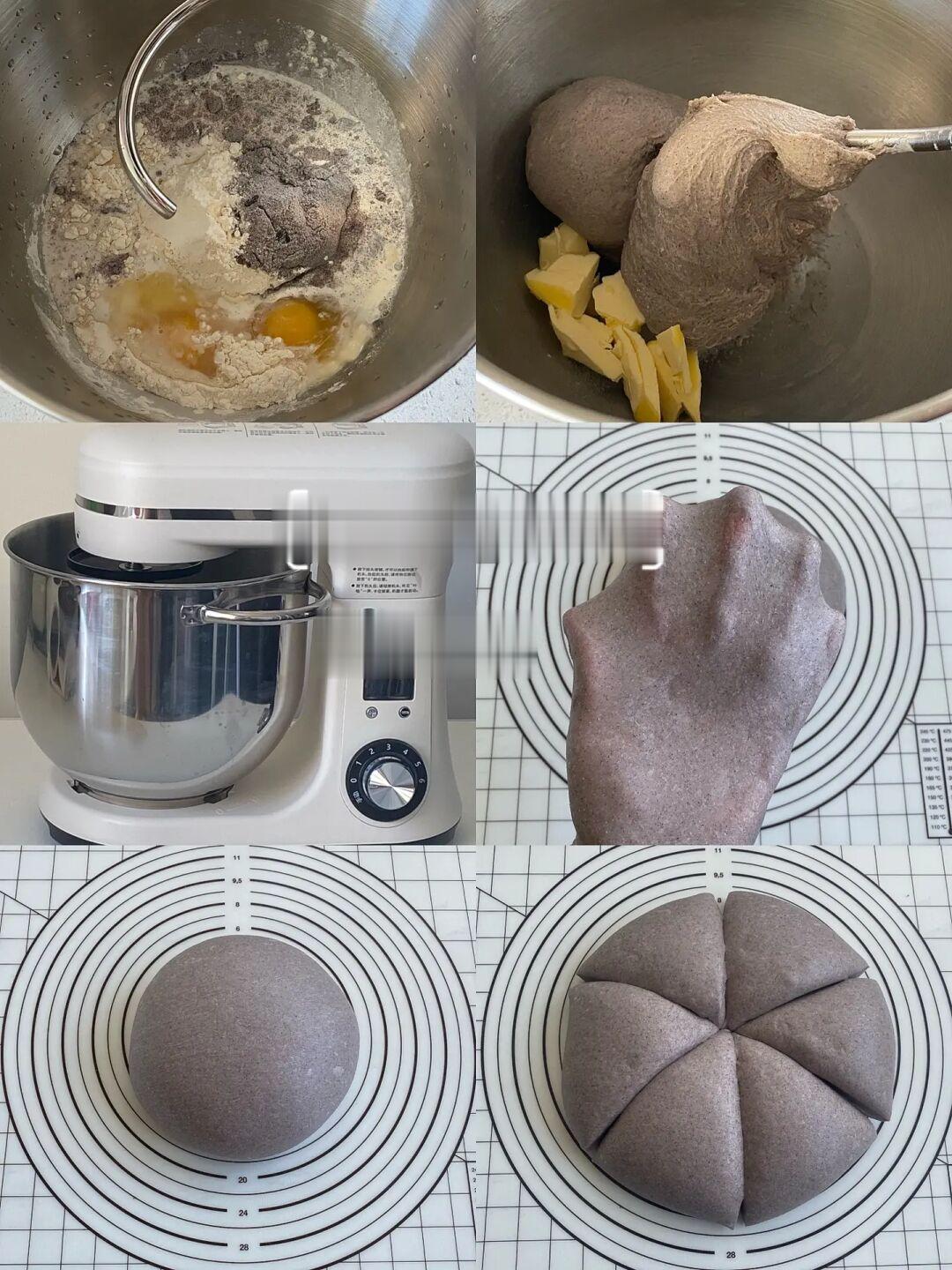1.除盐和黄油以外的食材倒入柏翠PE4633厨师机揉面桶内,先低速再高速混合,打至粗膜状态加盐和黄油,继续打面至完全扩展阶段。