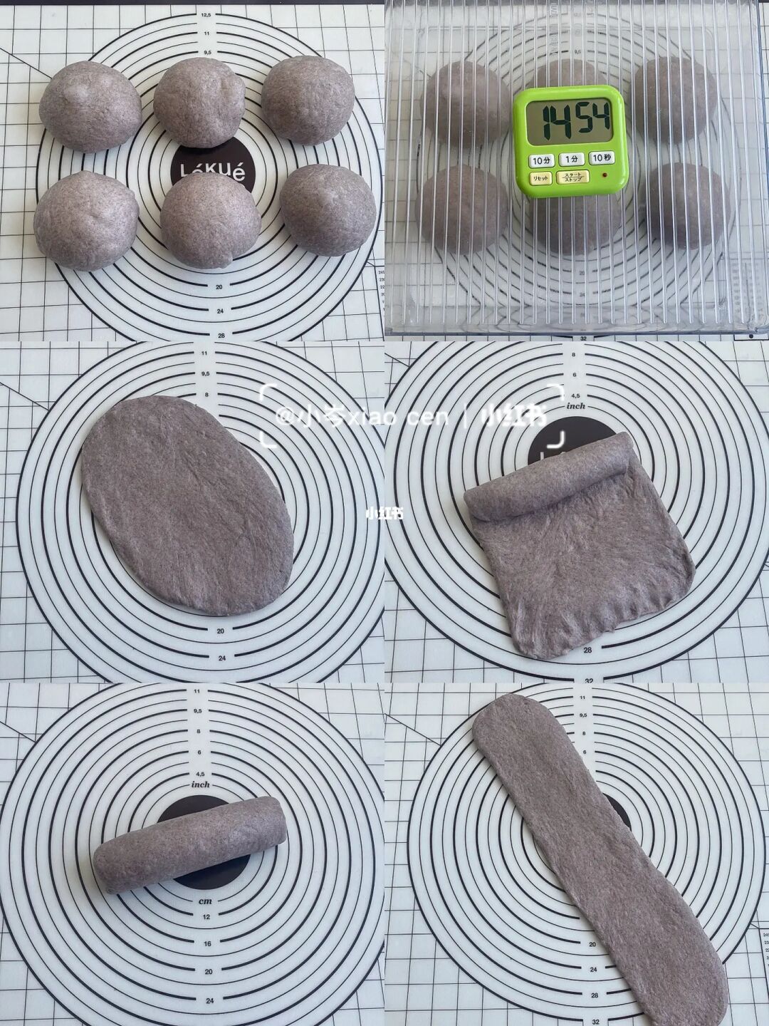 4.平均分成6份,滚圆,盖上保鲜膜,松弛15分钟。