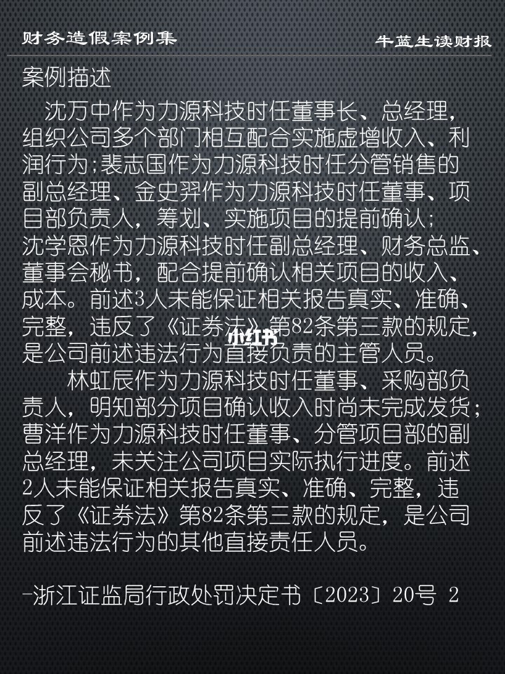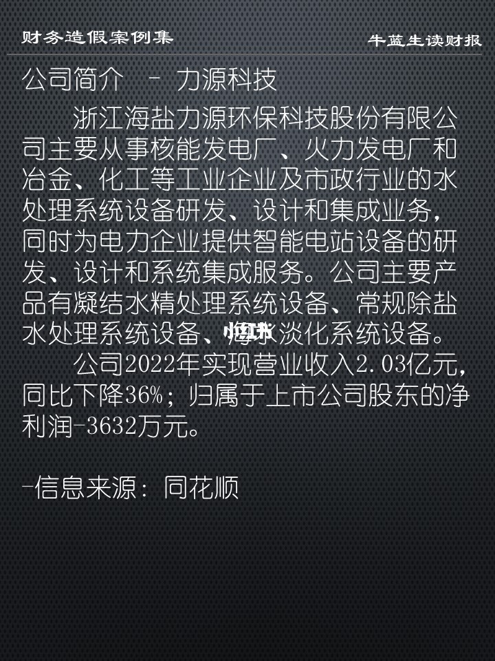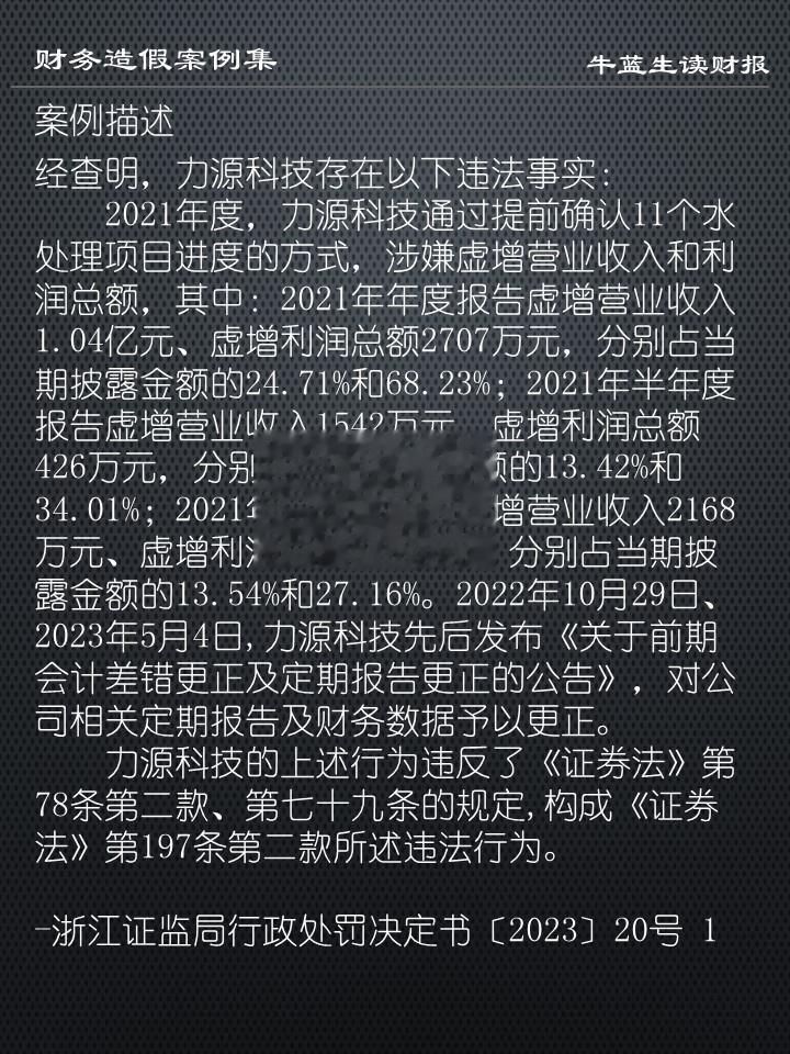 -2021年度,力源科技通过提前确认11个水处理项目进度的方式,涉嫌虚增营业收入和利润总额,其中:2021年年度报告虚增营业收入1.04亿元、虚增利润总额2707万元,分别占当期披露金额的24.71%和68.23%;2021年半年度报告虚增营业收入1542万元、虚增利润总额426万元,分别占当期披露金额的13.42%和34.01%;2021年三季度报告虚增营业收入2168万元、虚增利润总额543万元,分别占当期披露金额的13.54%和27.16%。2022年10月29日、2023年5月4日,力源科技先后发布《关于前期会计差错更正及定期报告更正的公告》,对公司相关定期报告及财务数据予以更正。