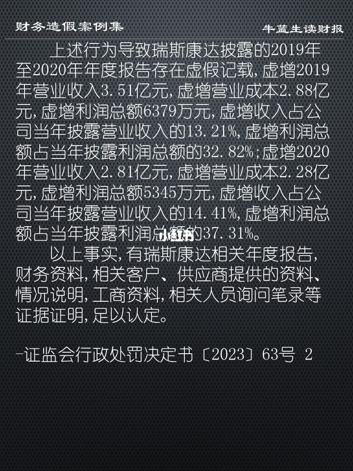 -上述行为导致瑞斯康达披露的2019年至2020年年度报告存在虚假记载,虚增2019年营业收入3.51亿元,虚增营业成本2.88亿元,虚增利润总额6379万元,虚增收入占公司当年披露营业收入的13.21%,虚增利润总额占当年披露利润总额的32.82%;虚增2020年营业收入2.81亿元,虚增营业成本2.28亿元,虚增利润总额5345万元,虚增收入占公司当年披露营业收入的14.41%,虚增利润总额占当年披露利润总额的37.31%。