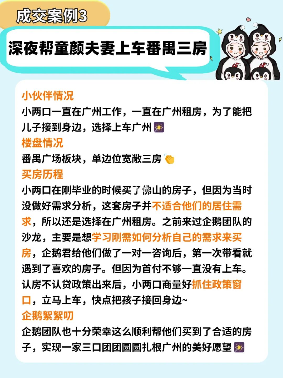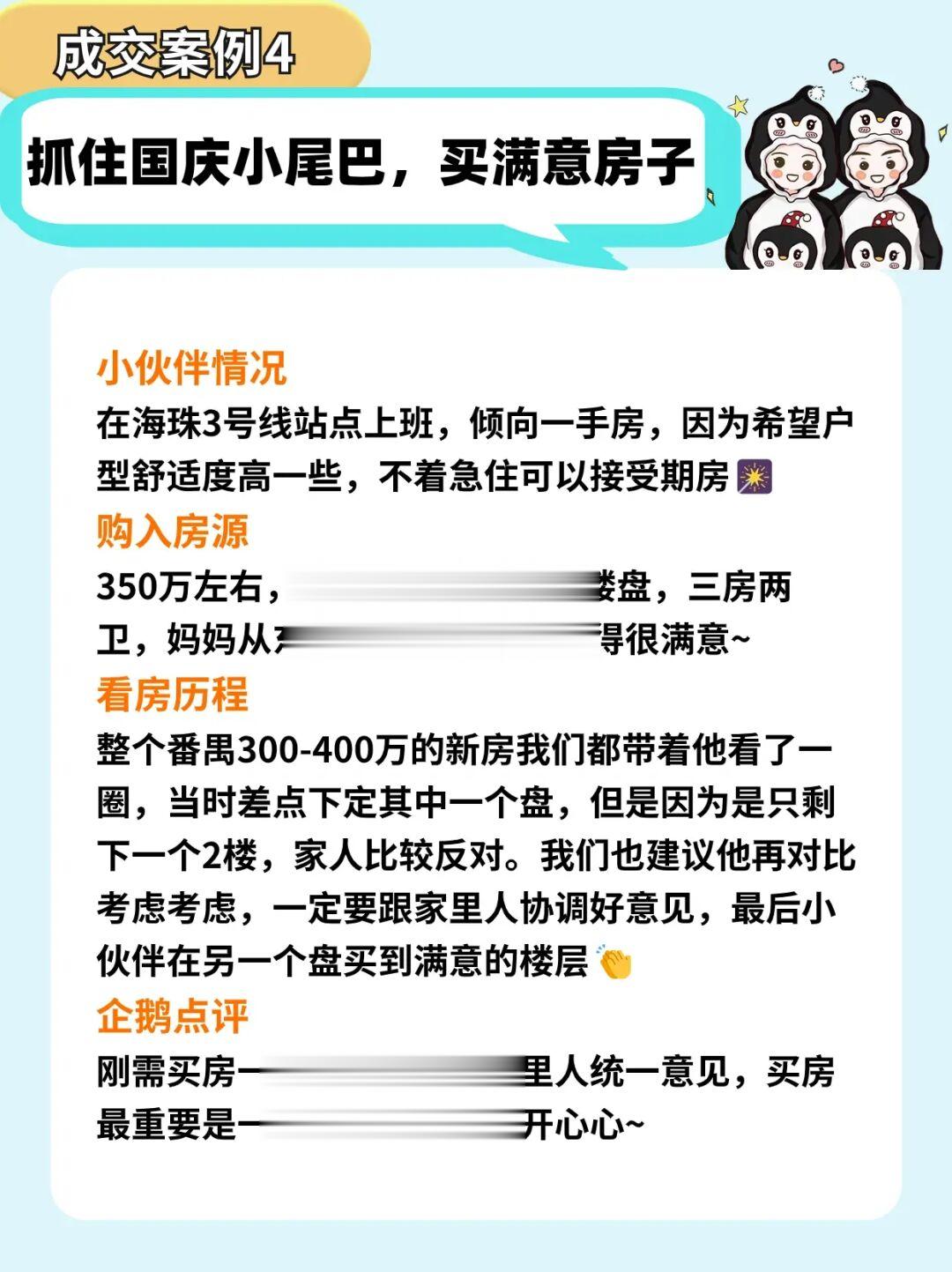 [派对R] 案例1:不到一周帮美女主播夫妇上车 案例2:差点入手公寓,听劝后回正轨 案例3:深夜帮童颜夫妇上车番禺三房 案例4:抓住国庆小尾巴,买满意房子 [买爆R] 企鹅陪你买房,专注服务刚需,希望有机会也帮你买到一套满意的房子~