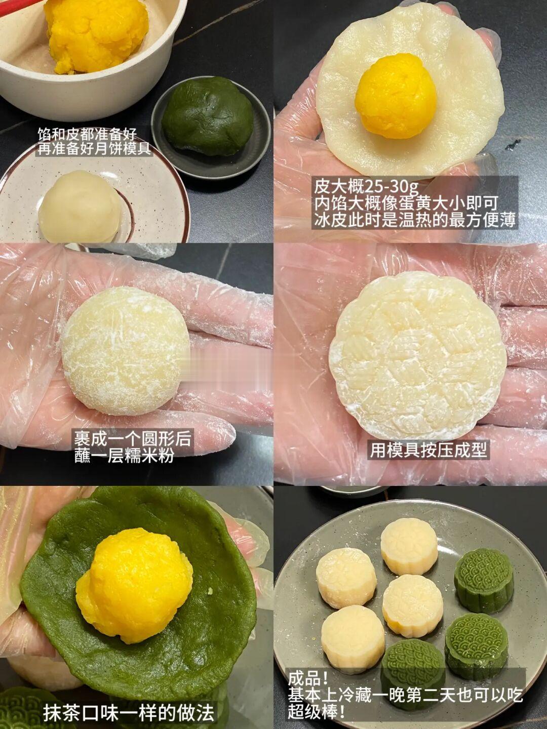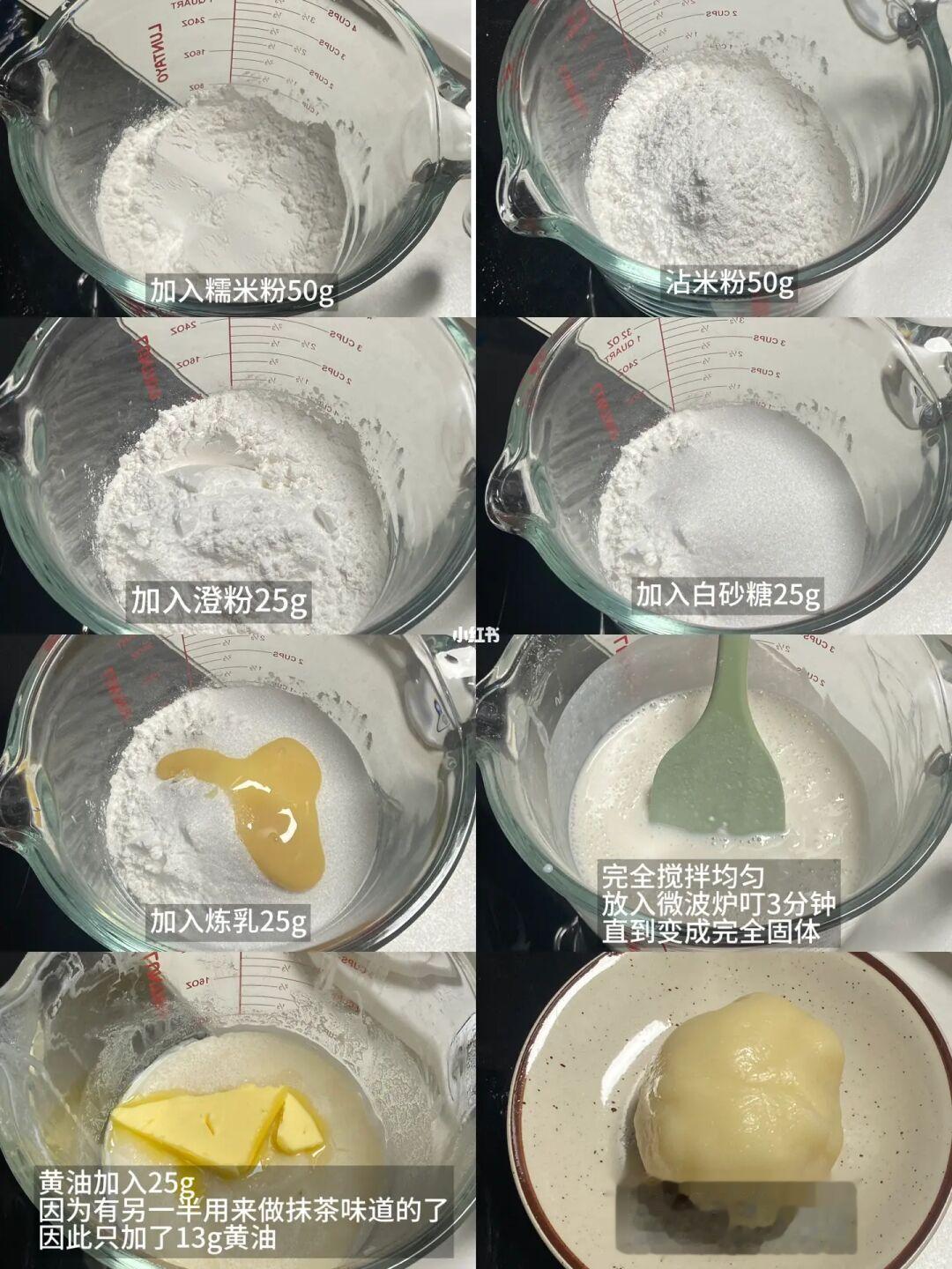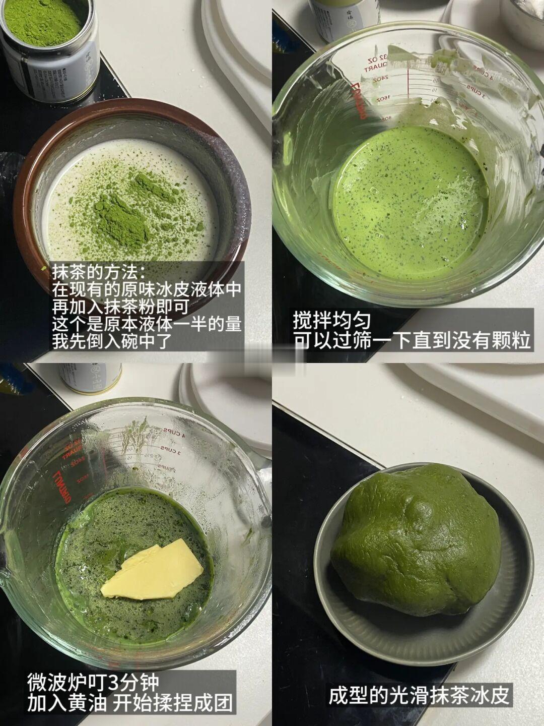 抹茶口味的冰皮:在混合好材料后,再加入10g的抹茶粉即可,和上述步骤一样,可以见图