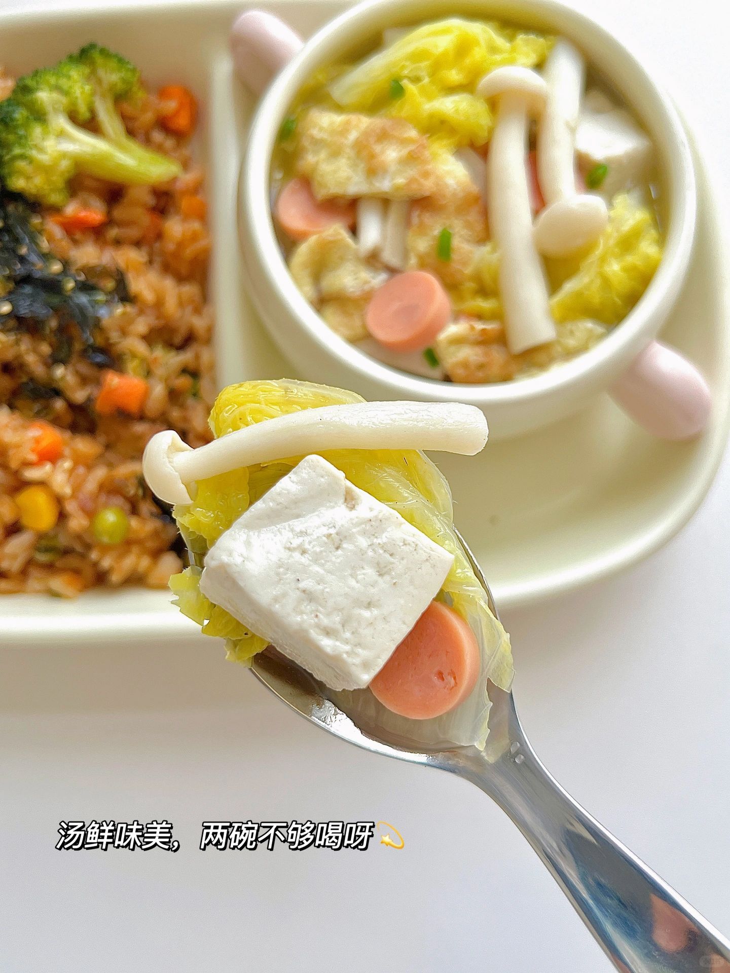 🧚🏻♀️这个菌菇豆腐汤搭配这个虾仁时蔬饭,真真是太美味了吧‼️汤鲜味美,好喝不油腻,我家宝宝喝的汤都不剩😊,米饭里有虾有菜有,营养也是满满,再配上孩子们都爱的海苔碎,真的是馋哭隔壁小朋友👬,太好吃了😋,赶紧安排起来吧~