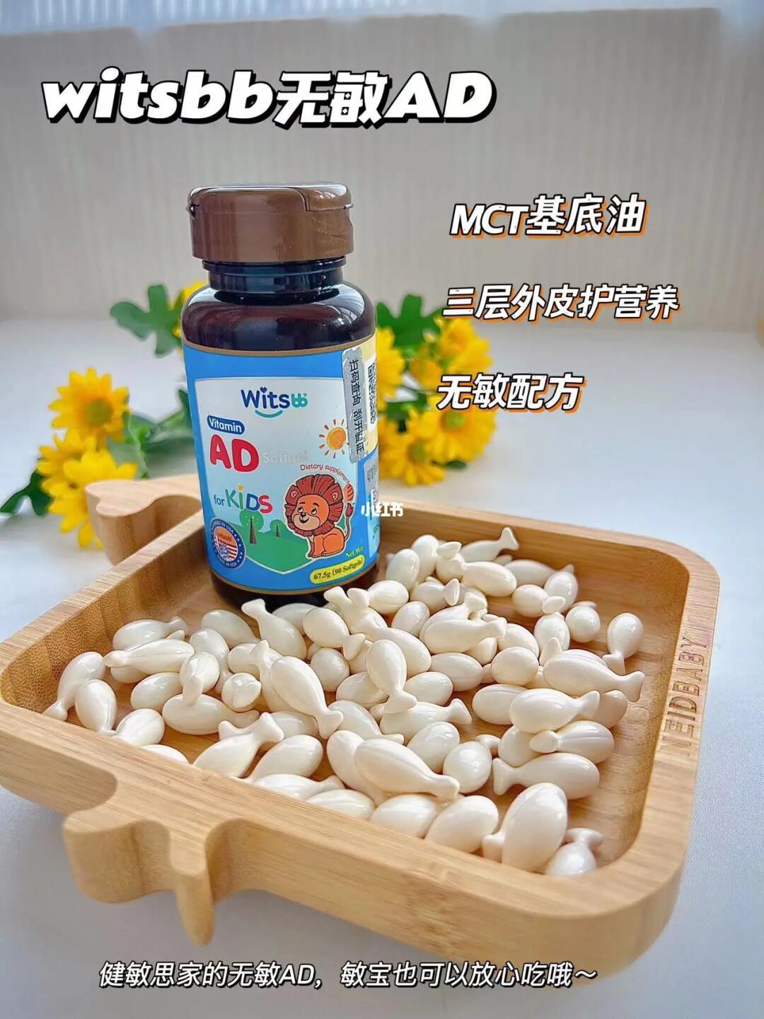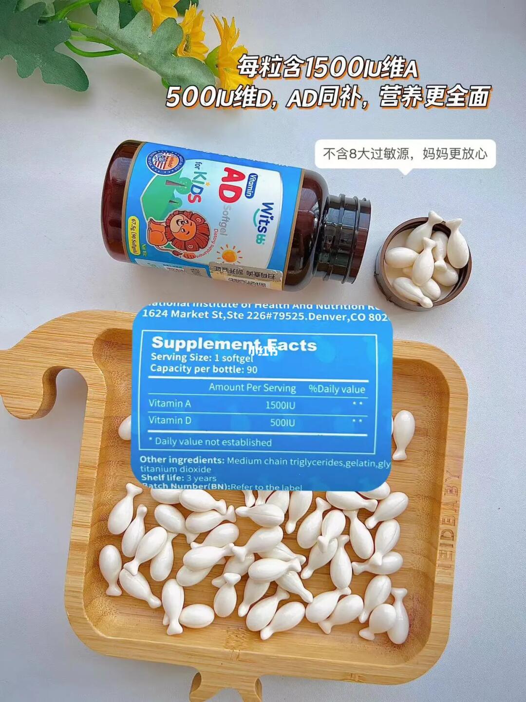 后来我给宝宝换了健敏思家的无敏AD,这款不含牛奶蛋白、海鲜、麸质等8大常见过敏原,用的是MCT油,还有FDA认证,每粒含1500IU维生素A和500IU维生素D,AD同补更方便科学~
