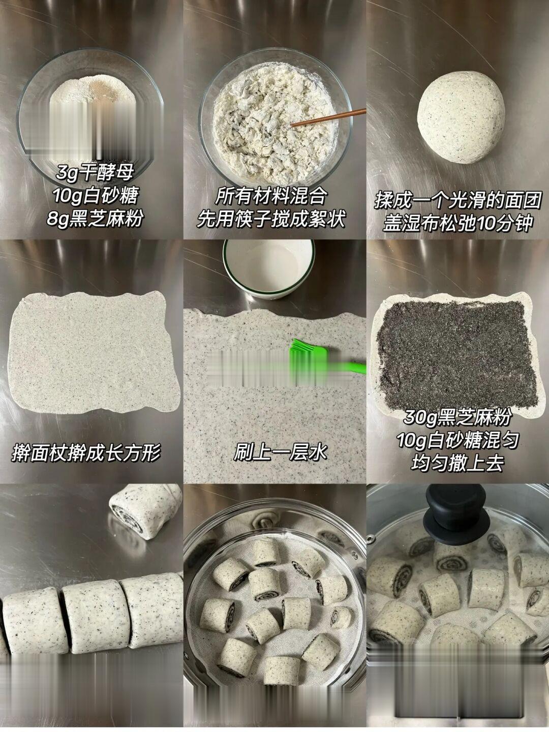 1️⃣300g中筋面粉+3g干酵母+155g水+8g黑芝麻粉+10g白砂糖,先用筷子搅成絮状,再手揉成光滑的面团,盖上湿布松弛10分钟