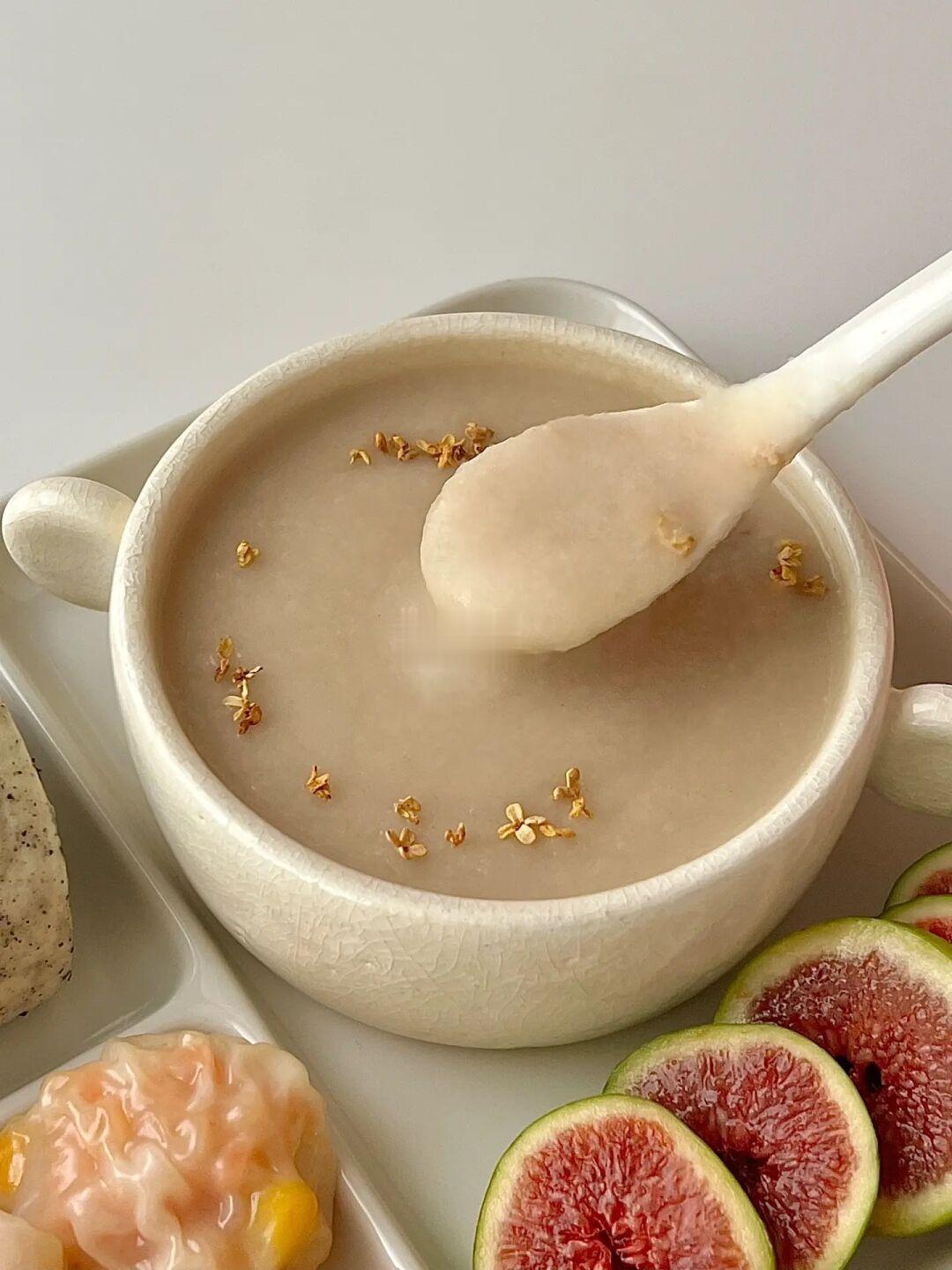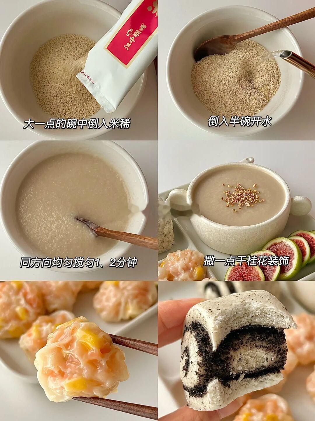 准备一点大一点碗,倒入一袋米稀,加入开水同方向搅拌1、2分钟至细腻顺滑,撒上干桂花装饰