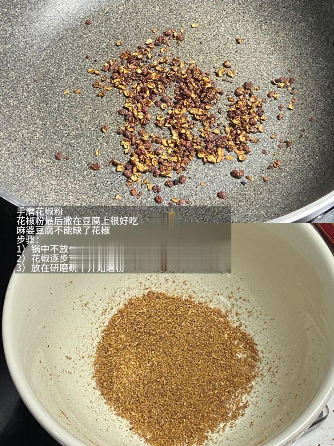 1)磨花椒粉:锅中不下油,直接小火炒花椒,等待花椒颜色变黄变脆,开始研磨成粉,备用