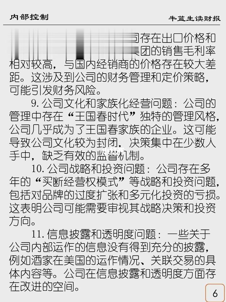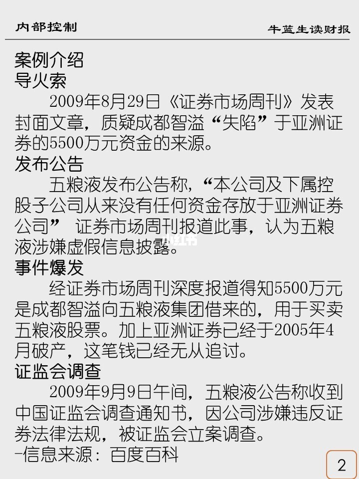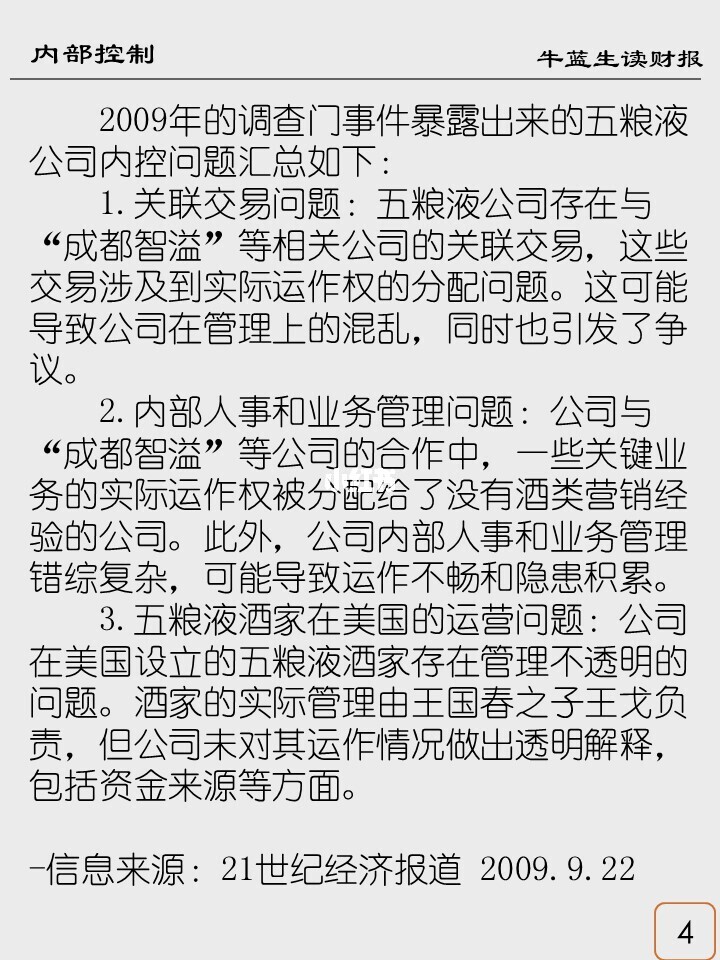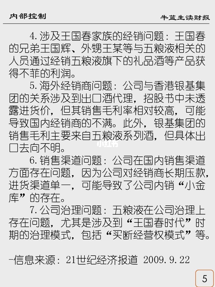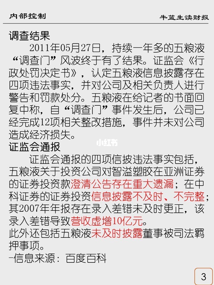 ✈主要内控问题:2009年公司在以下方面缺乏有效的内部控制:关联交易,内部人事和业务管理,对高管的约束,对外投资的管理,销售渠道,销售渠道等。 后果:五粮液公司及相关负责人受到警告和处罚。 相关事件:2009年五粮液“调查门”
