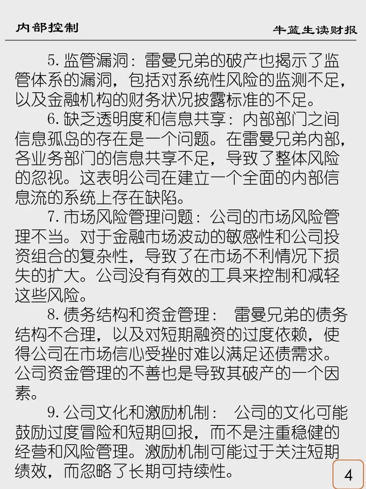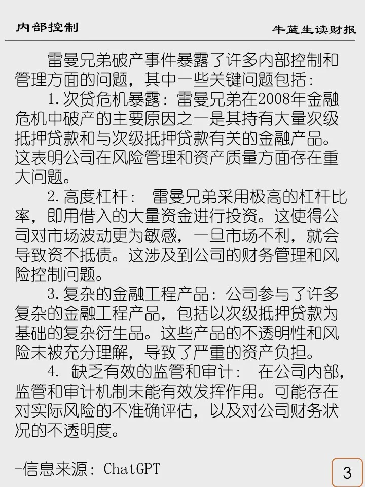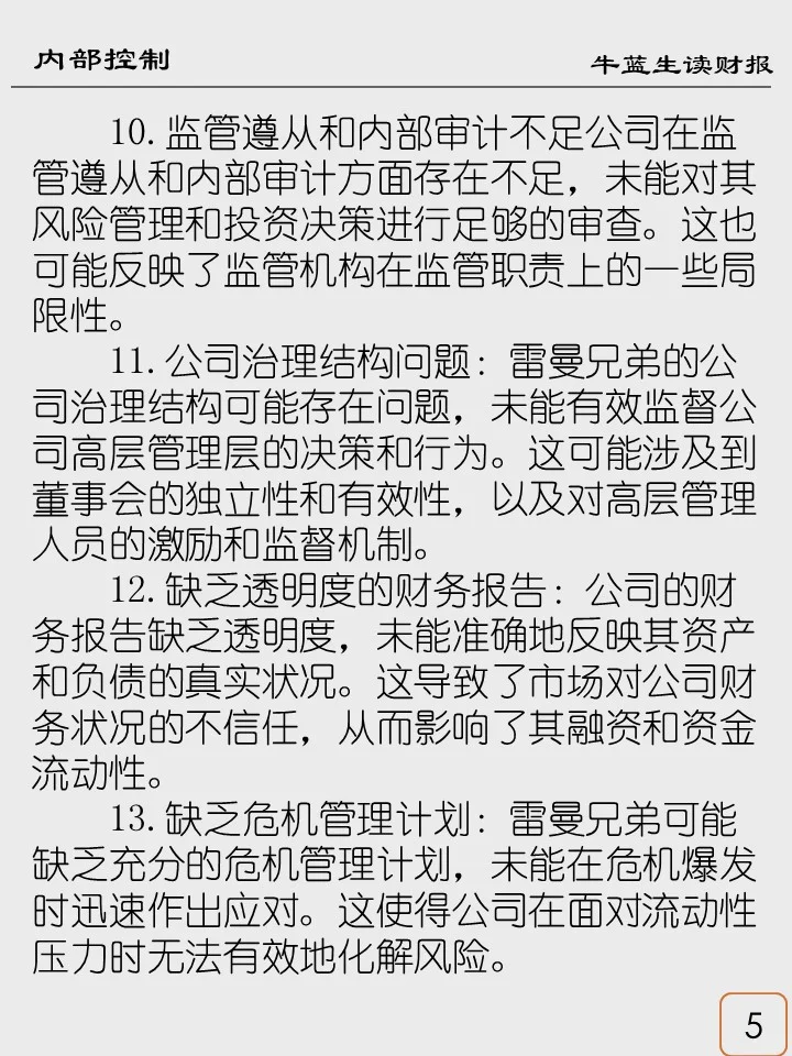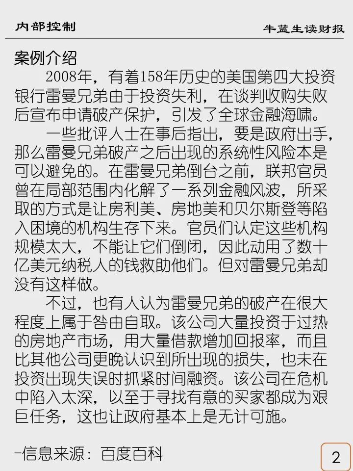 ✈主要内控问题:公司在以下方面缺乏有效的内部控制:金融资产风险管理,对复杂金融产品的透明性和风险认知,缺乏有效的监管和审计,危机管理,激励机制过于关注短期绩效而忽略了长期可持续性,等。 后果:公司倒闭。 相关事件:2008年雷曼兄弟倒闭,并引发金融海啸