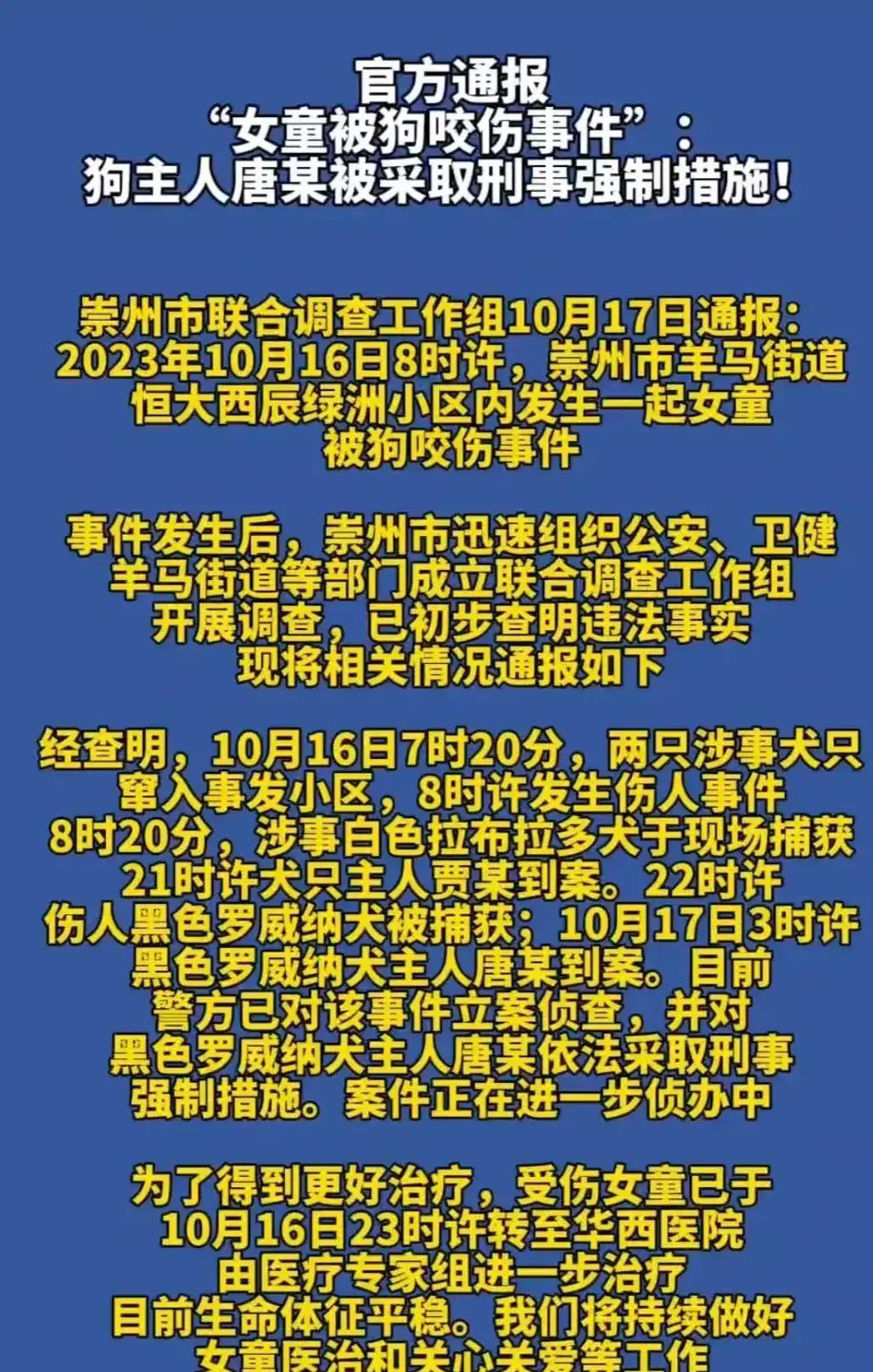 崇州黑狗咬人逃逸案最新通报!主人唐某被刑拘后还想抵赖,无耻!央媒都怒了:必须绳之以法,严惩。狗不教,主之过,咬伤人,要连坐! 主人唐某像往常一样,远程无绳遛狗。没想到他高大凶猛的黑狗罗威纳犬,光天化日之下从大人怀中抢走2岁女童,咬伤其右肾,致其肋骨骨折。