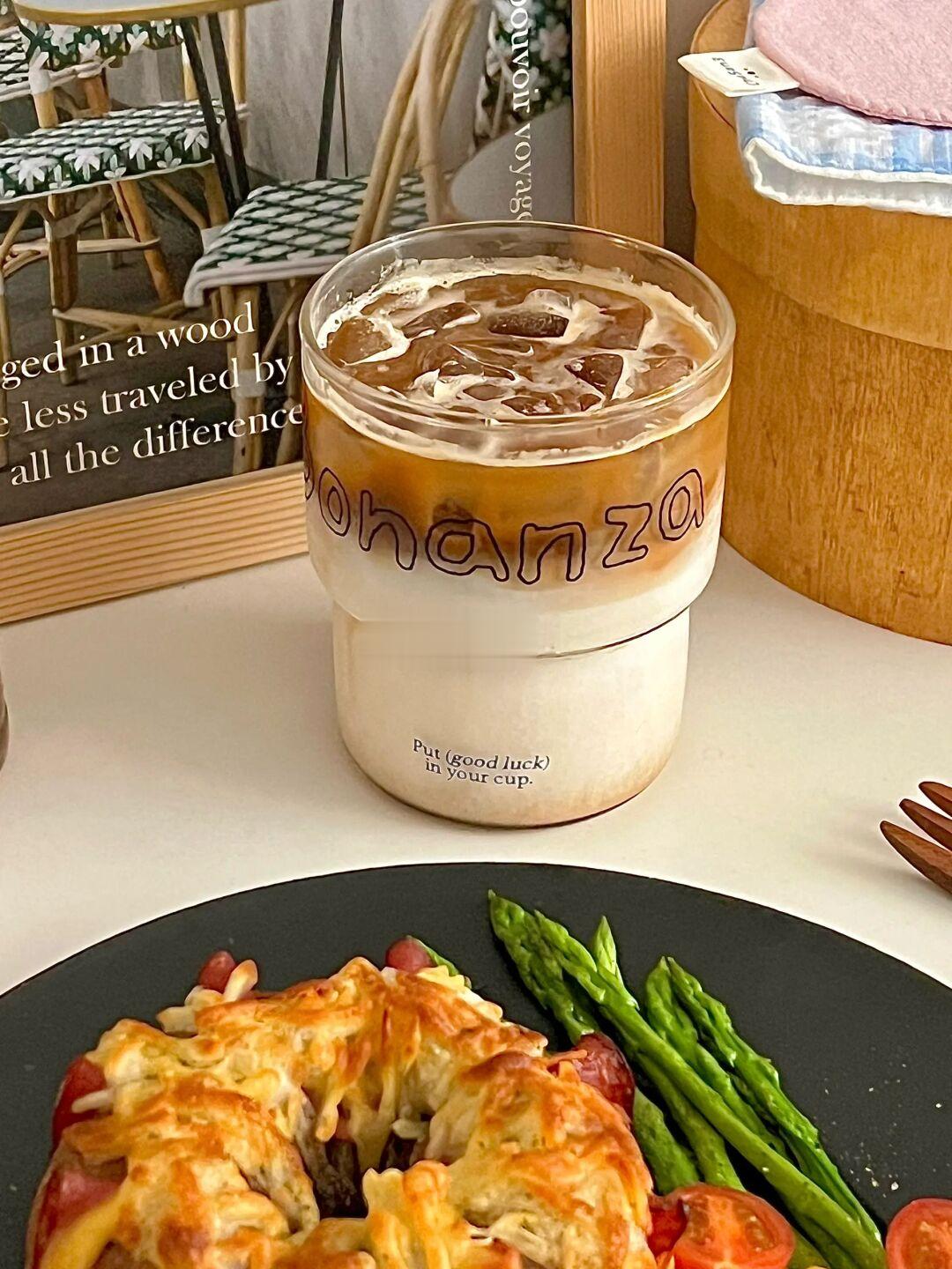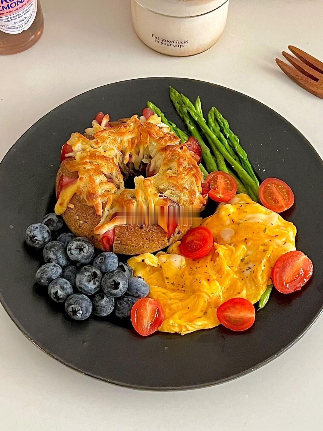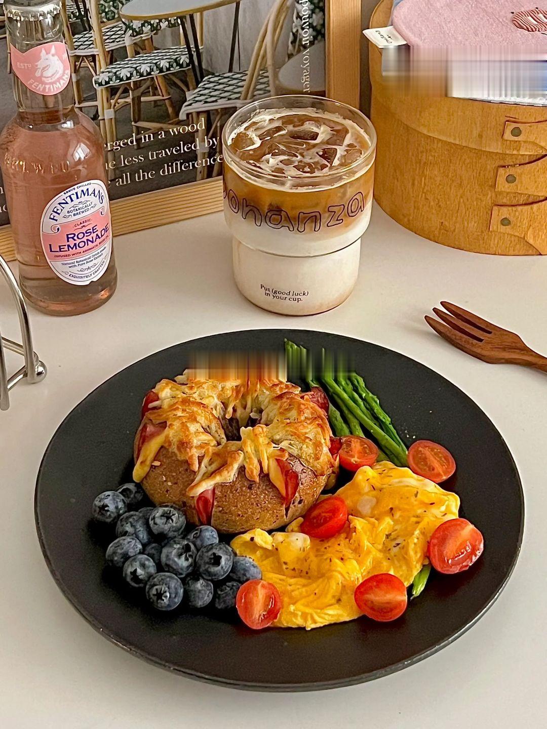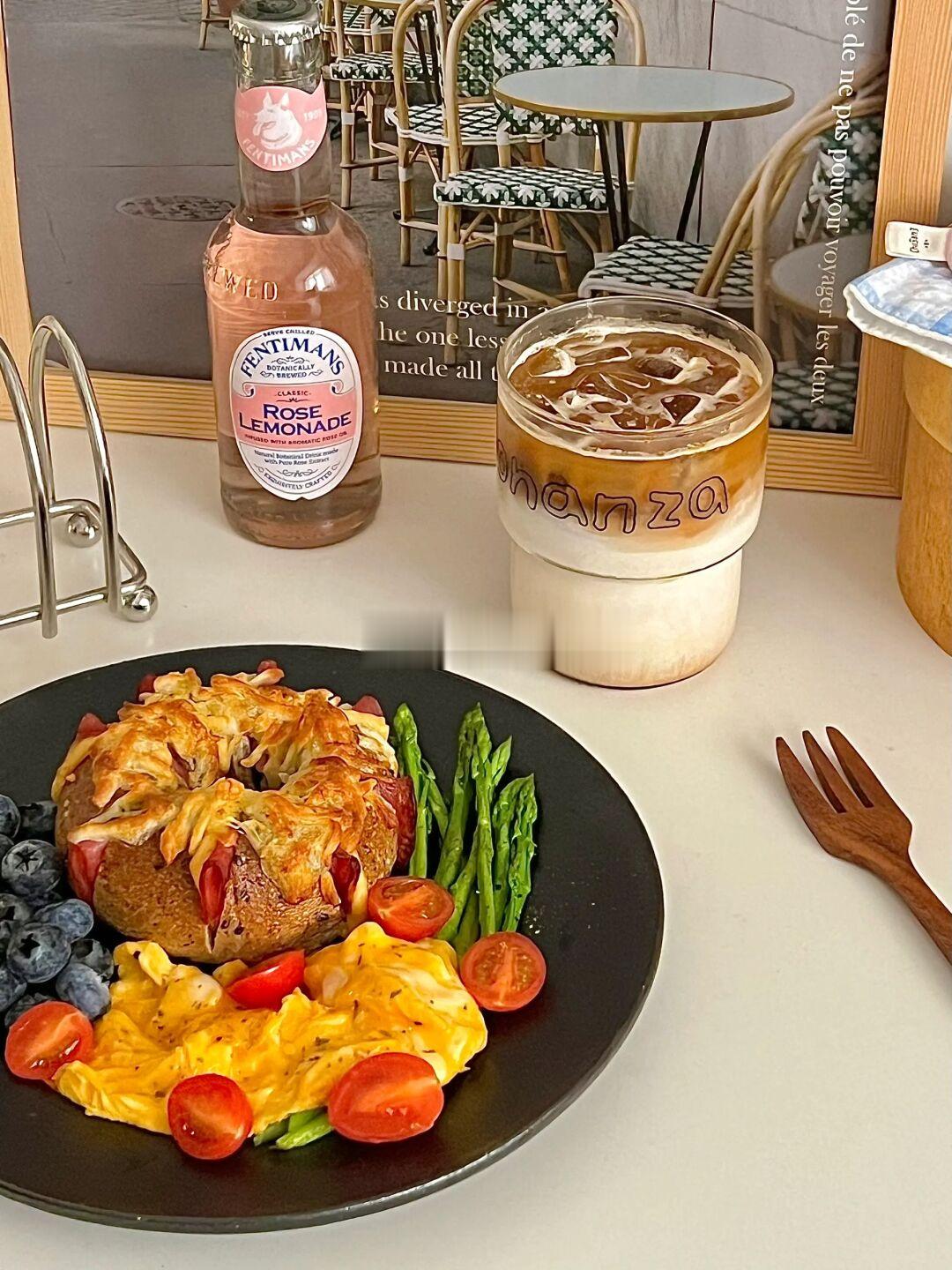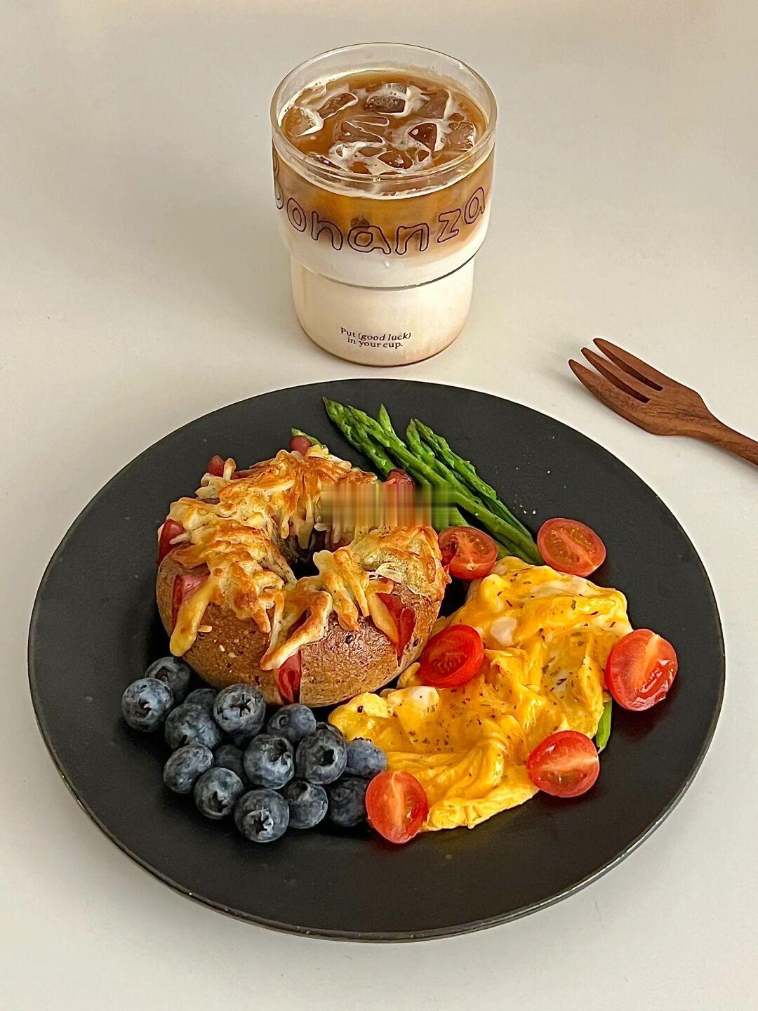 怎么又升温了☀️散步回来有点热,喝一杯少冰的冰拿铁吧~ - 1️⃣贝果解冻后切四刀底部不切断,均分成八等分 2️⃣缝隙里挤上低脂沙拉酱和番茄酱,再把芝士片和火腿片切小块塞进去 3️⃣撒上一圈马苏里拉芝士碎,放入空气炸锅170度8分钟(根据自己的炸锅温度调整) 4️⃣芦笋切去根部焯水1分钟后煎熟,鸡蛋+牛奶+黑胡椒盐打散小火炒成滑蛋,摆盘再放上蓝莓和切开的小番茄,撒上一点欧芹碎 - 杯子千千万新的最好看[扯脸H]还是玻璃杯装冰拿铁最合适!咖啡分层治愈又好看~