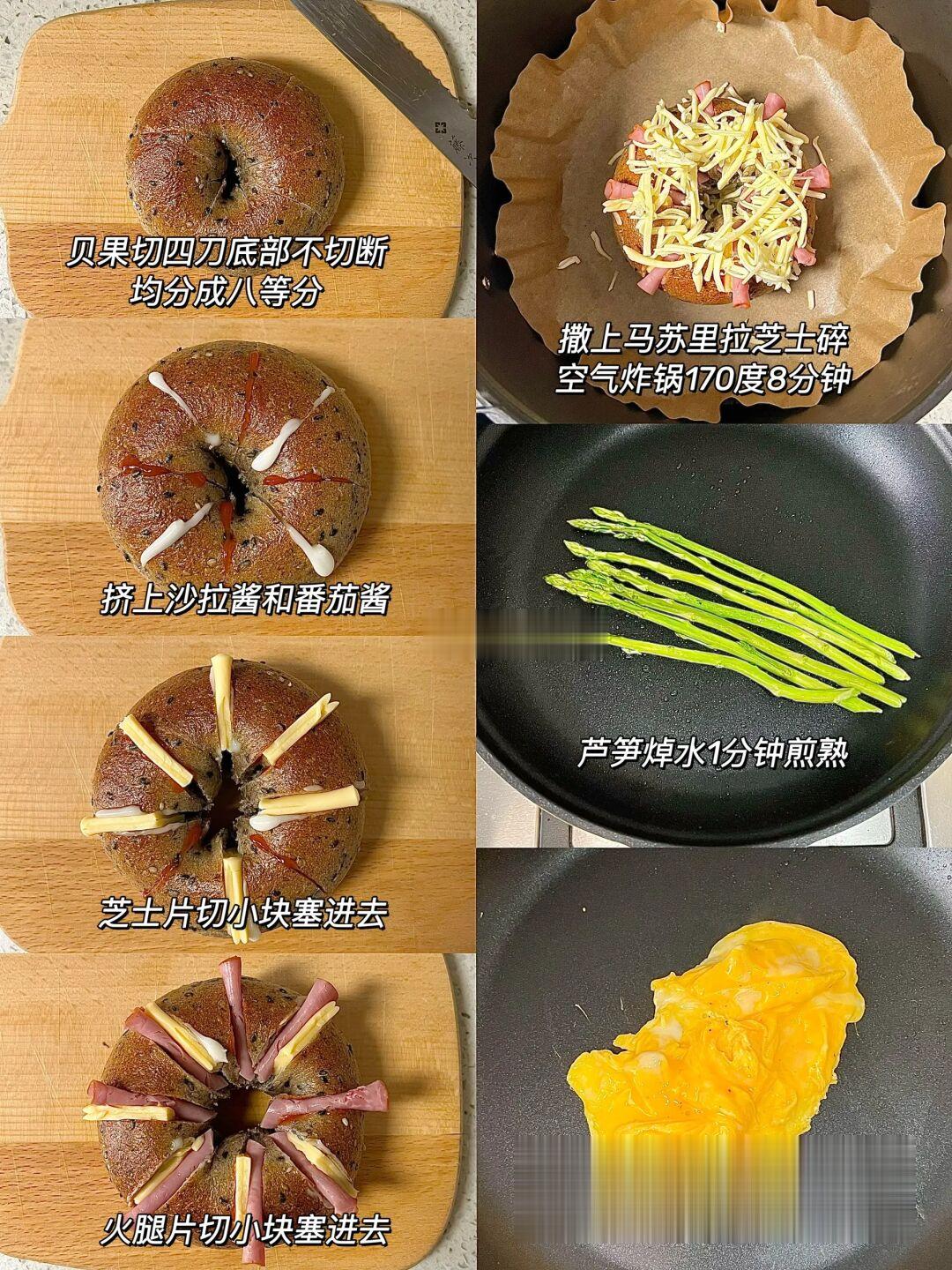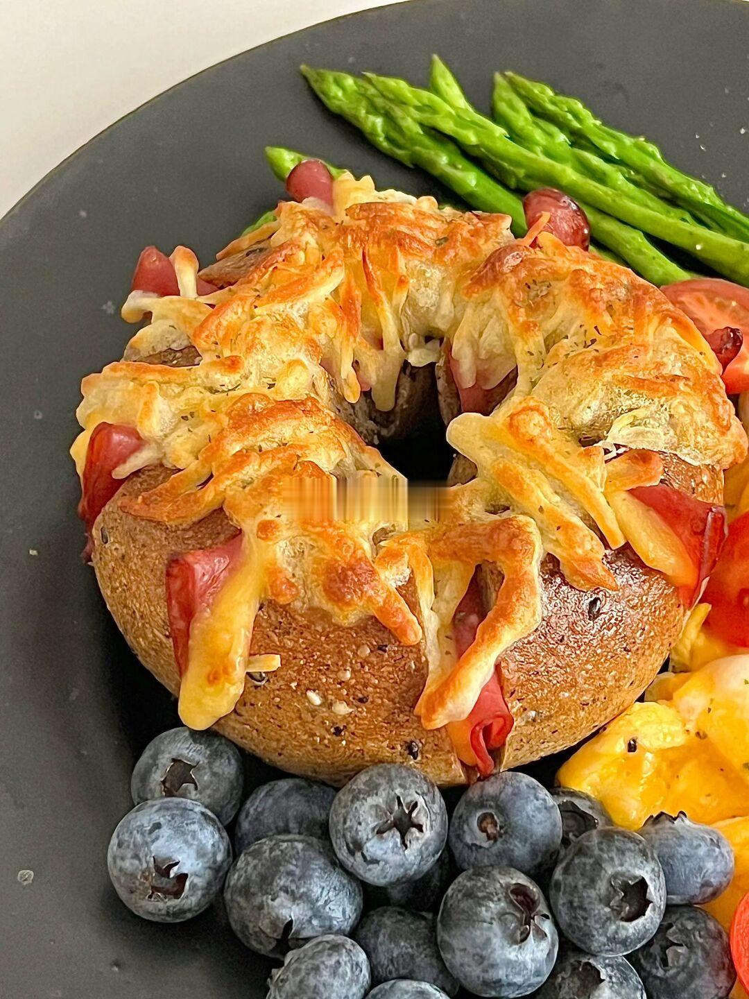 早餐|芝士火腿贝果披萨🥯芦笋滑蛋🍳冰拿铁