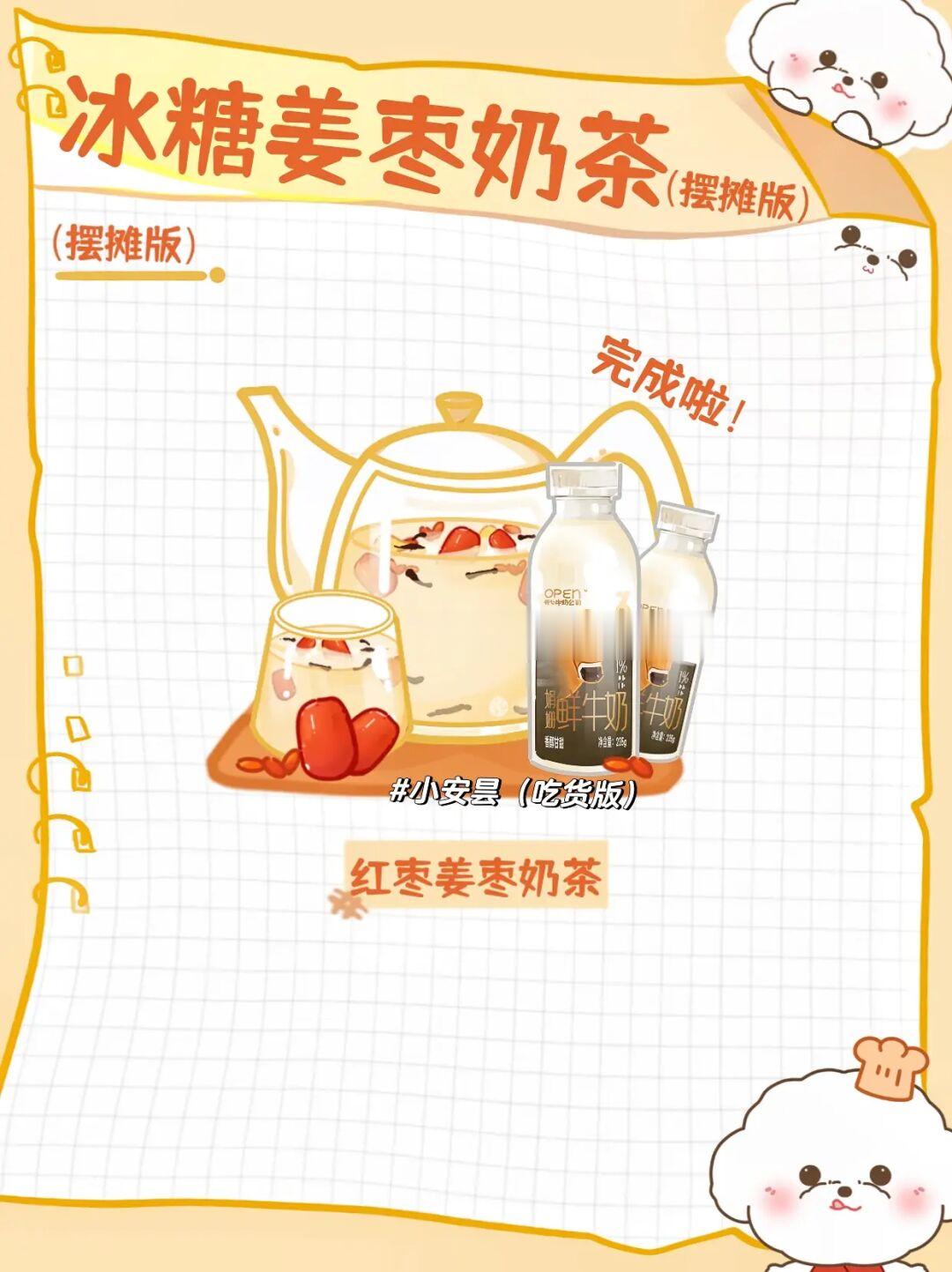 红枣姜枣奶茶(摆摊版) 暖暖的很贴心💗 🥣材料准备 10克红茶➕250ml鲜牛奶(我用的娟姗鲜牛奶)🥛➕15克糖浆(冰糖)➕4颗红枣➕15克枸杞➕2、3片姜片 🥣制作步骤 1⃣️在茶壶中加入10克红茶,4颗红枣,15克枸杞,2片薄薄的生姜! 2⃣️加入15克冰糖,加入100ml水!开小火加热!冰糖煮化之后,再加入500ml鲜牛奶,再煮几分钟,直到沸腾!过滤茶叶,完成啦! (低温巴氏杀菌短保鲜奶,4.2g/100g优质乳蛋白,蛋白质含量高于国标45%,1%珍稀奶源,口感香醇甘甜,超奈斯~)