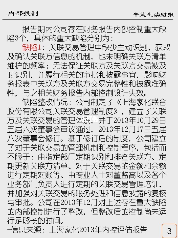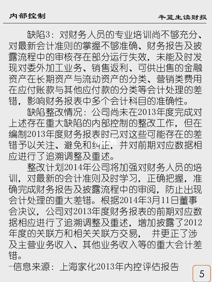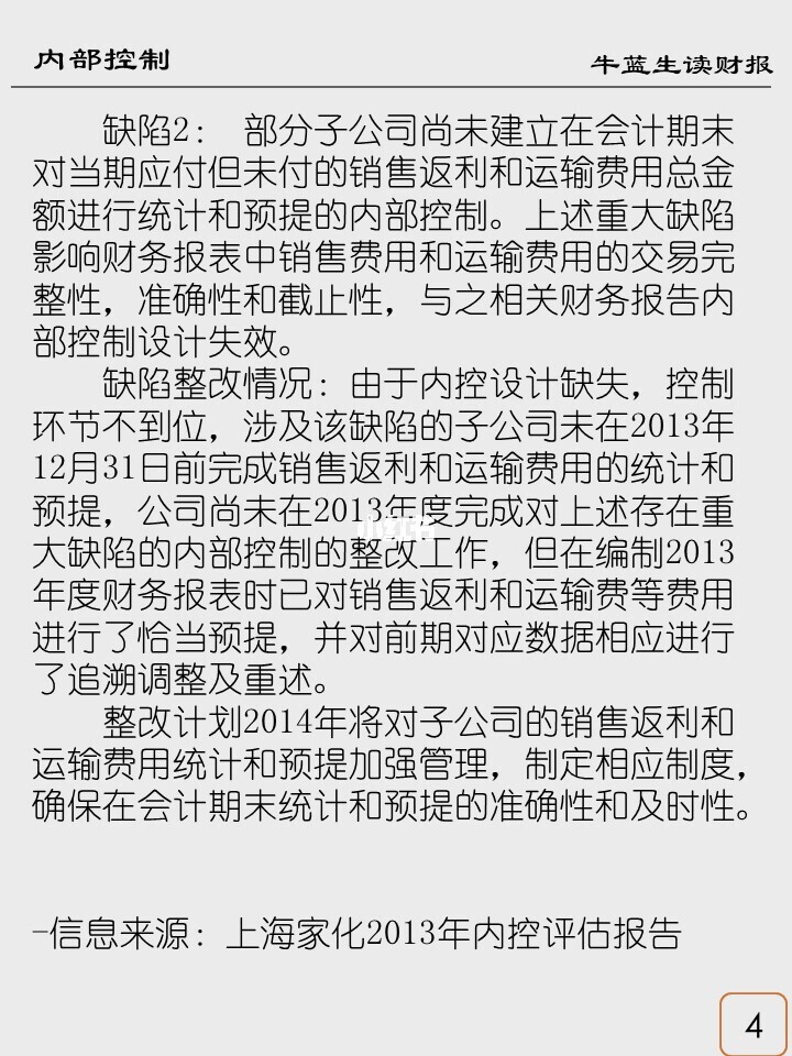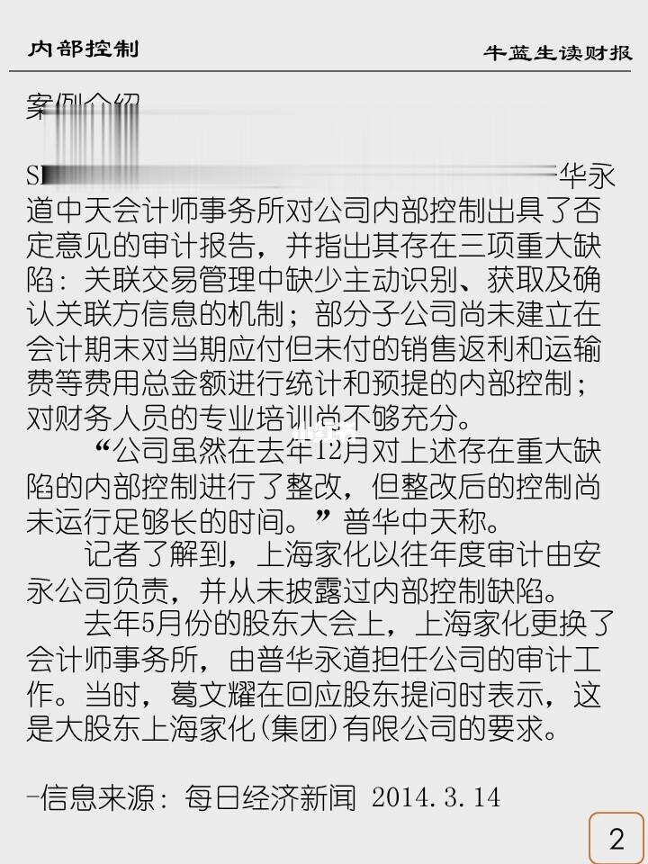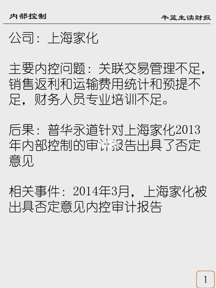 ✈主要内控问题:关联交易管理不足,销售返利和运输费用统计和预提不足,财务人员专业培训不足。 后果:普华永道针对上海家化2013年内部控制的审计报告出具了否定意见 相关事件:2014年3月,上海家化被出具否定意见内控审计报告