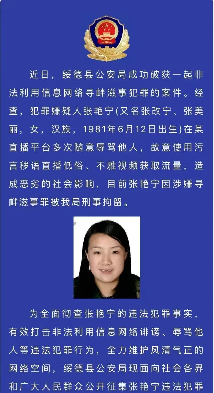 为全面彻查张艳宁的违法犯罪事实,有效打击非法利用信息网络诽谤、辱骂他人等违法犯罪行为,全力维护风清气正的网络空间,特向全网征集线索进行清查。