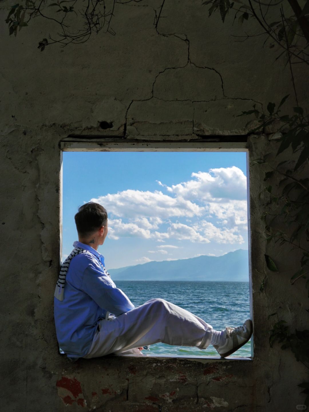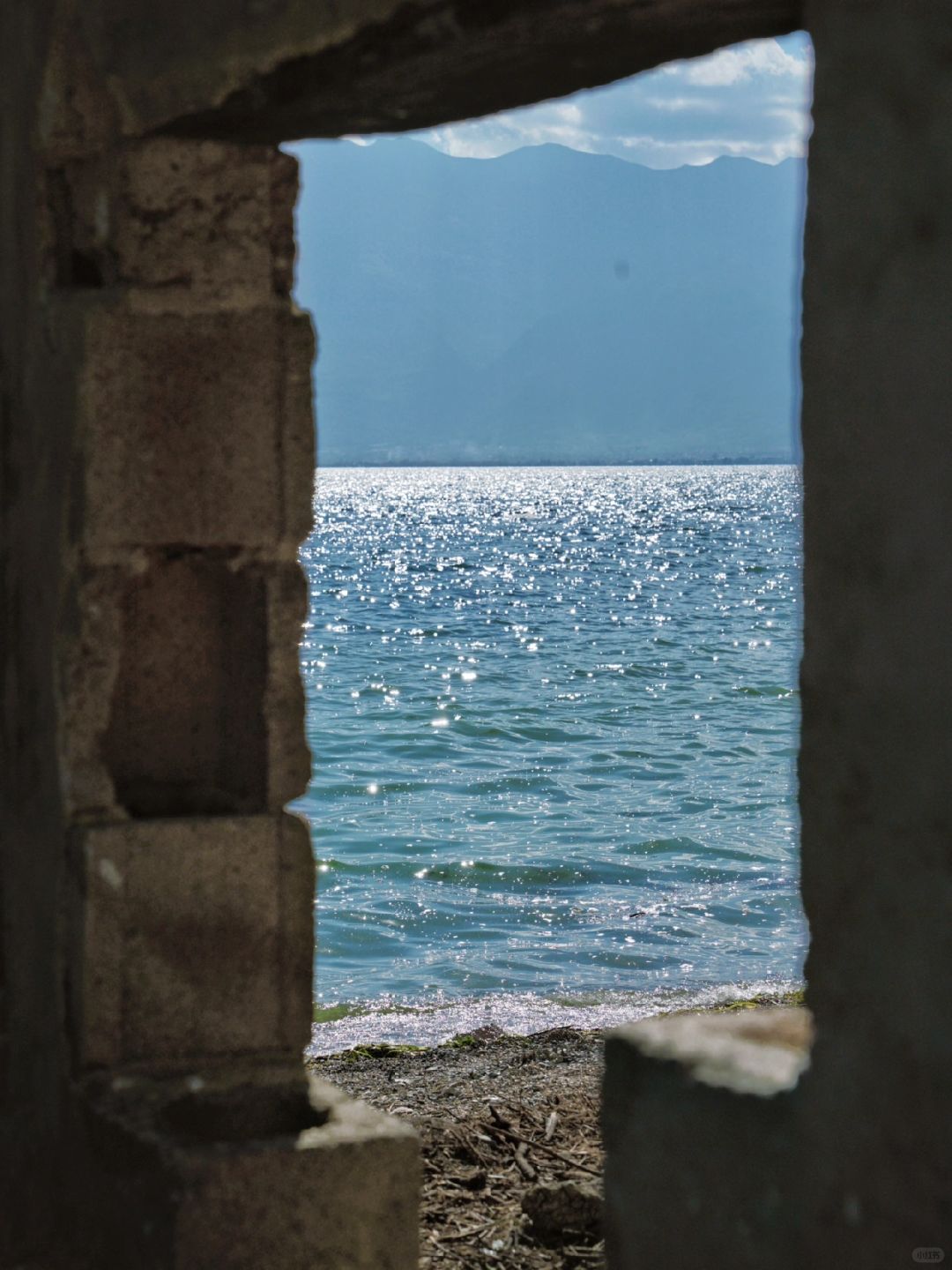 3、岸边有几面废弃的墙,透过窗口拍出来很文艺,很多在这排队拍照