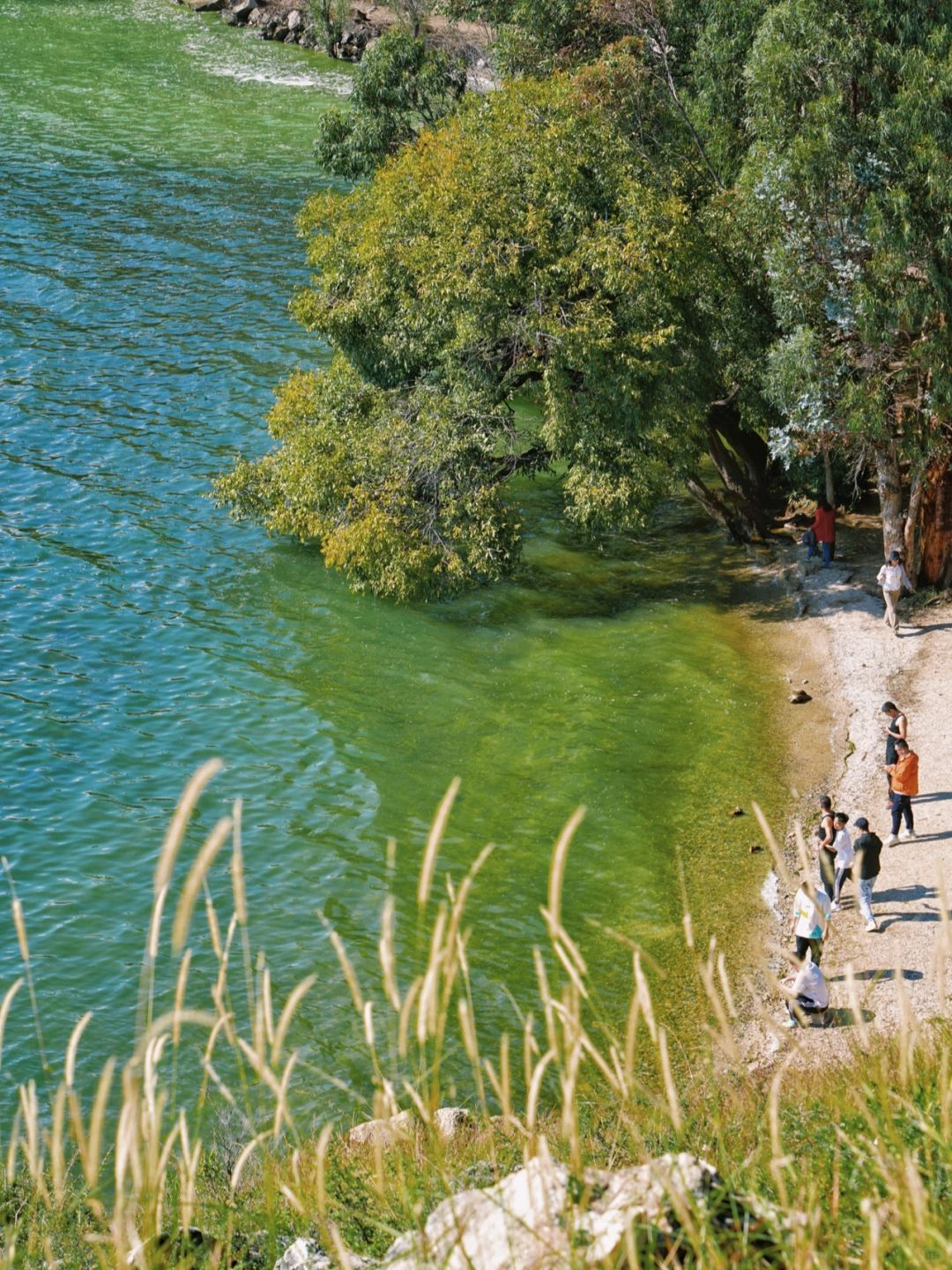2、走到山下的岸边,可以拍,岸边的水泛着清澈的绿色