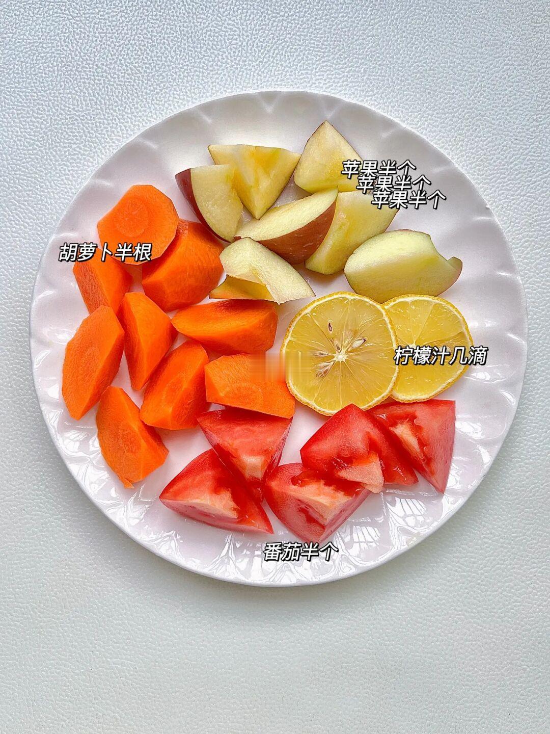胡萝卜半根,番茄半个,苹果半个,柠檬汁几滴