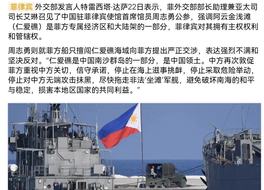 对于菲律宾,中国的态度变了!在中菲船只“相撞”事件发生之后,菲律宾召见我方人员表示抗议,没想到我方人员当场反将了菲律宾一军。菲律宾外交部发言人特雷西塔·达萨22日表示,菲外交部部长助理兼亚太司司长艾琳召见了中国驻菲律宾使馆首席馆员周志勇公参,强调所谓的阿云金浅滩(仁爱礁)是菲方专属经济区和大陆架的一部分,菲律宾对其拥有“主权权利和管辖权”。