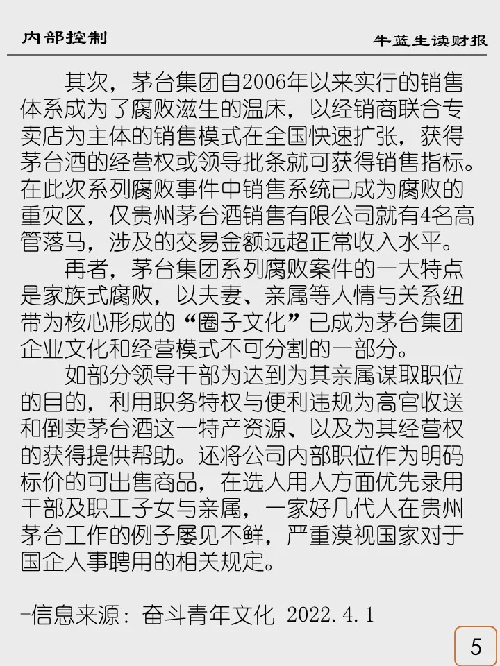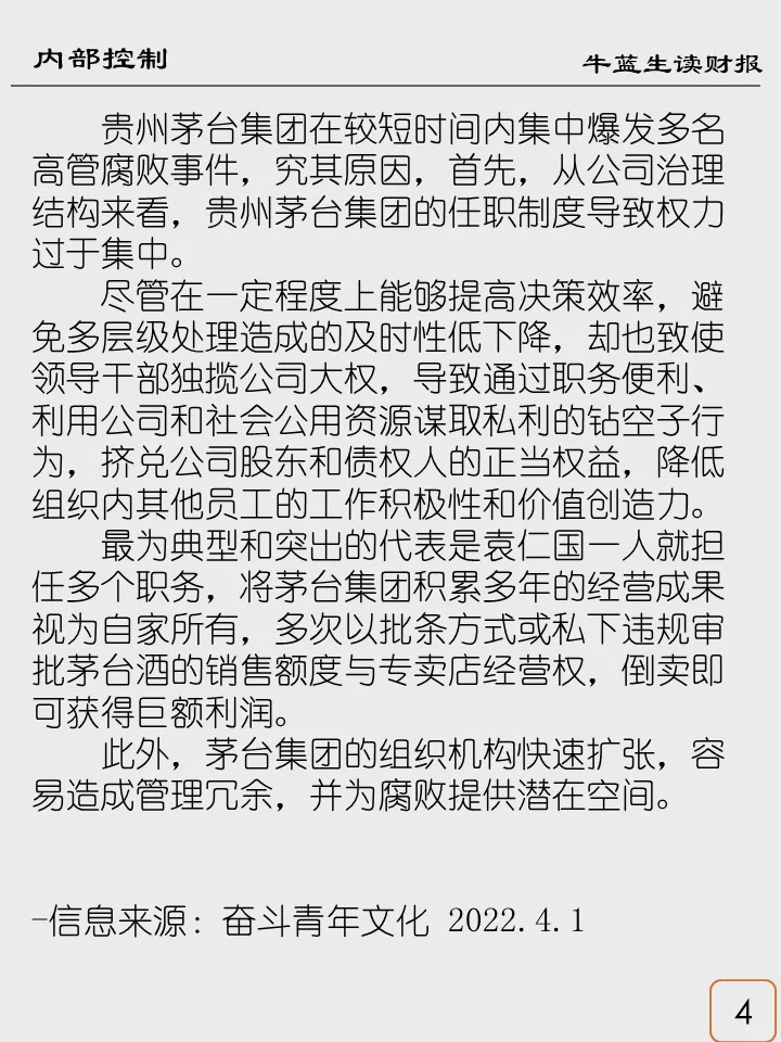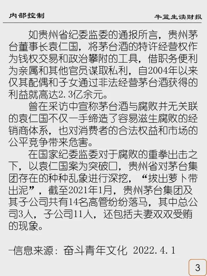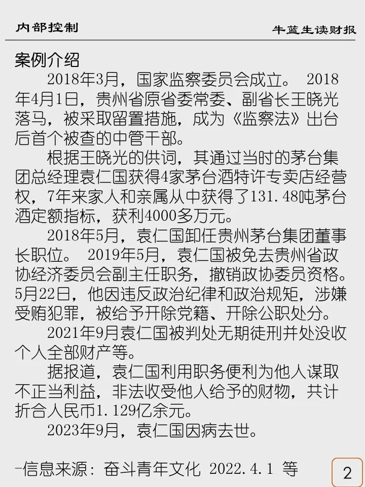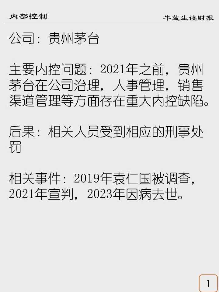 ✈主要内控问题:2021年之前,贵州茅台在公司治理,人事管理,销售渠道管理等方面存在重大内控缺陷。 后果:相关人员受到相应的刑事处罚 相关事件:2019年袁仁国被调查,2021年宣判,2023年因病去世。