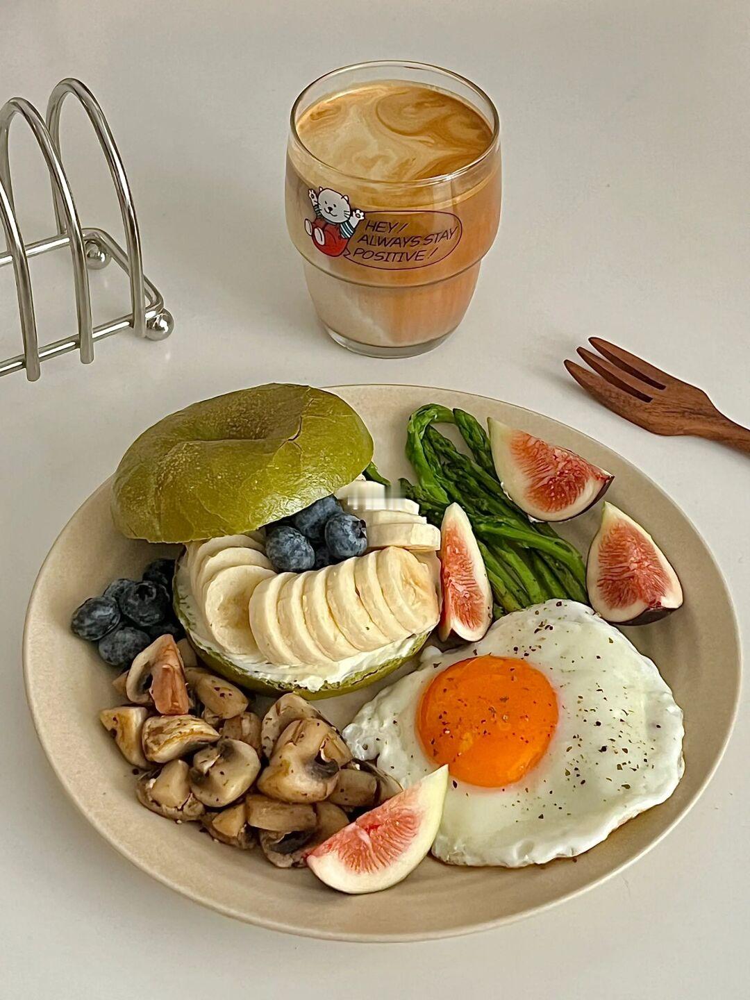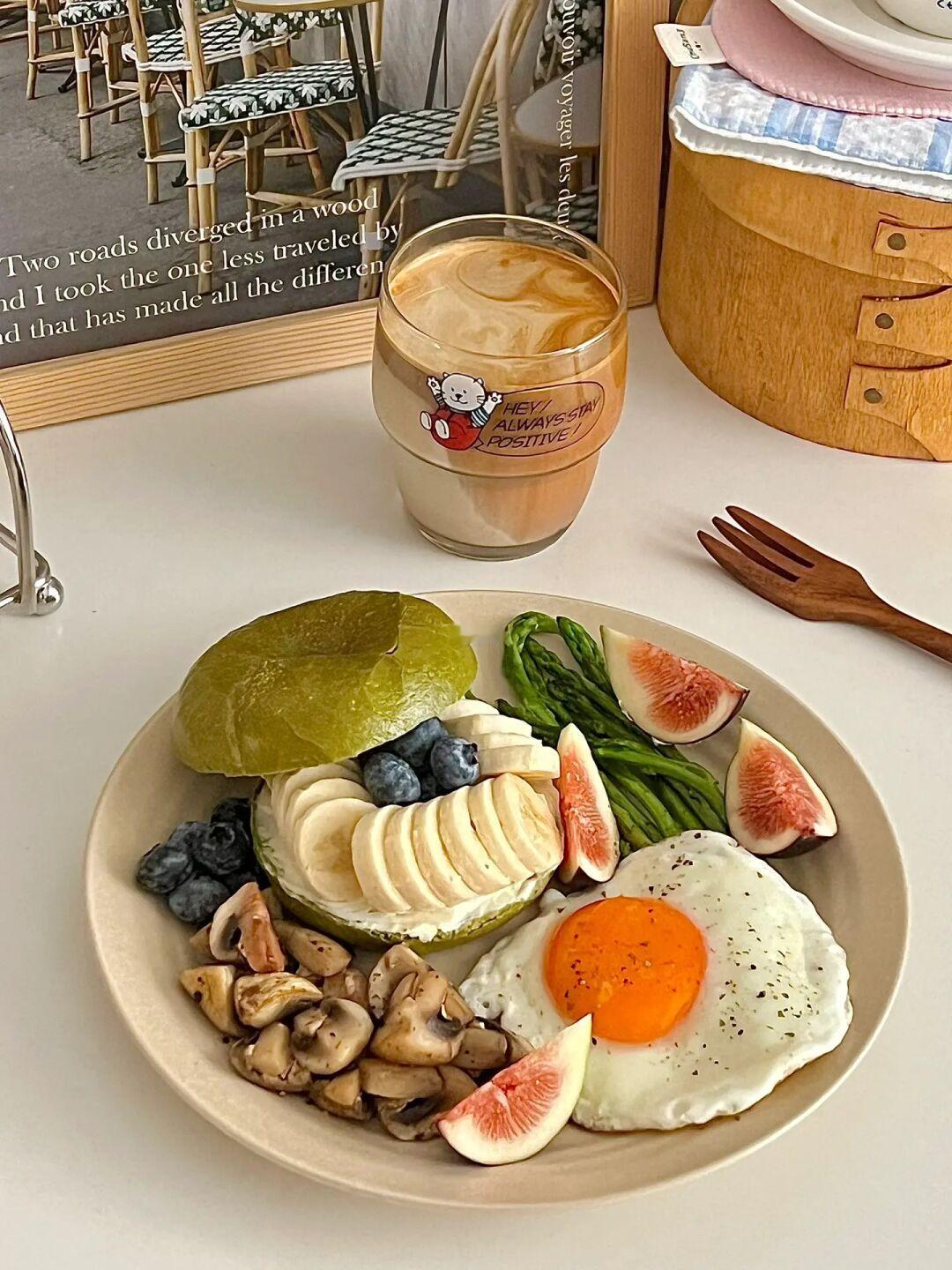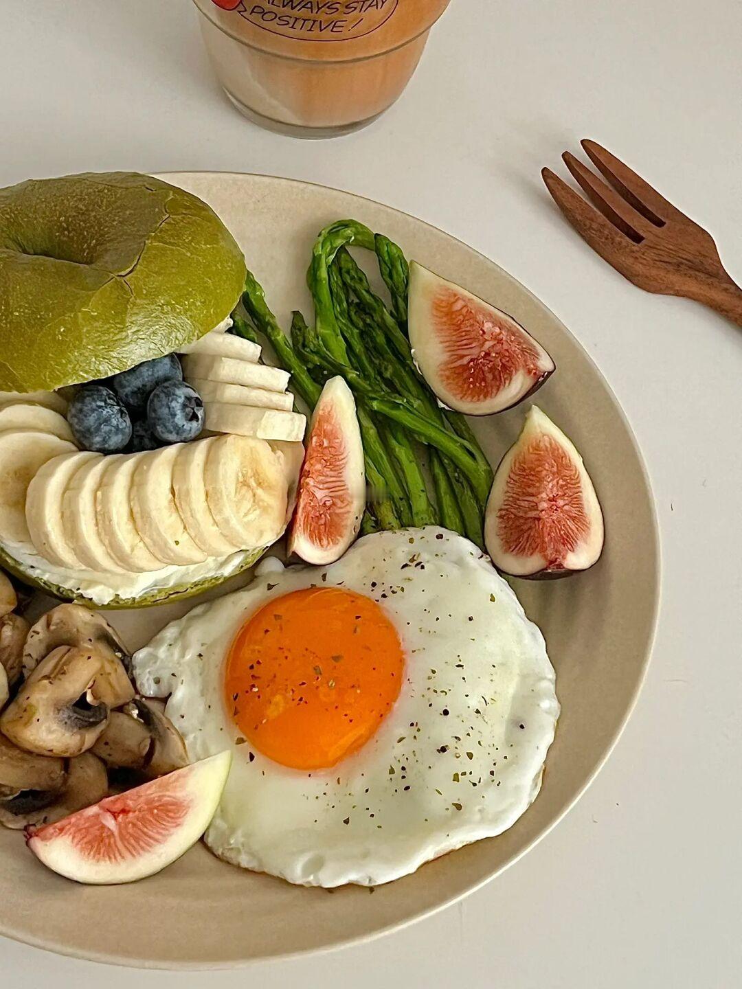 2️⃣芦笋切去根部焯水1分钟煎熟,口蘑炒熟黑胡椒盐调味,煎一个单面溏心蛋,撒上欧芹碎,所有材料摆盘再放上无花果和蓝莓