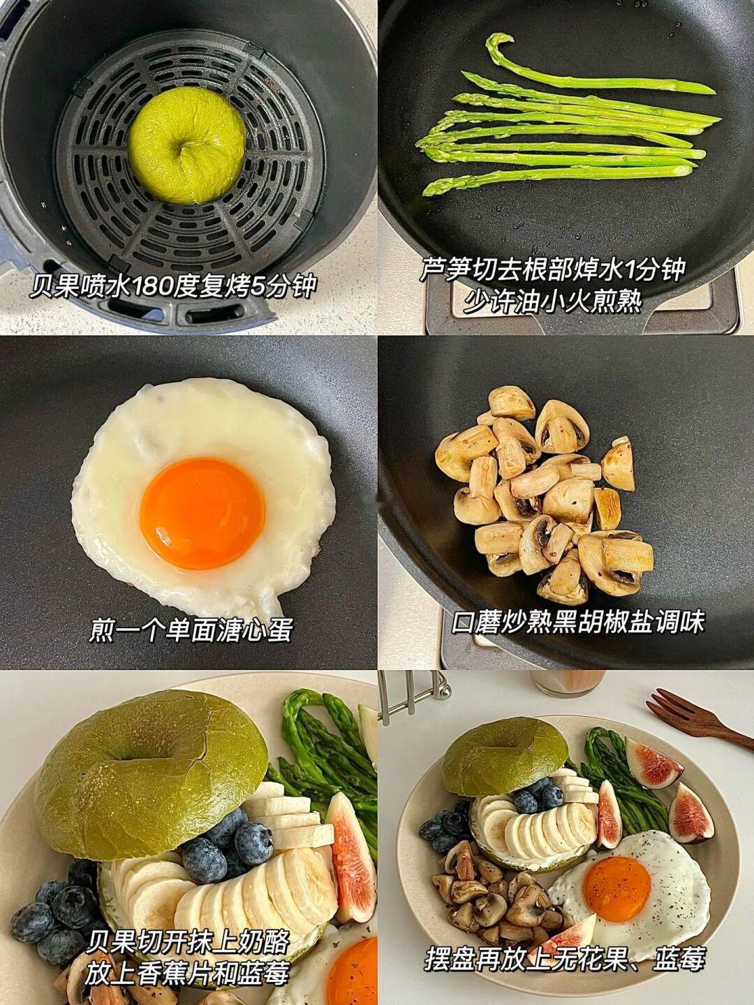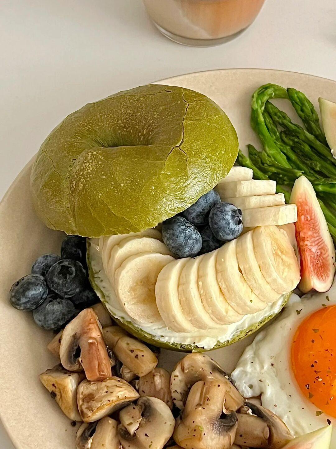 1️⃣抹茶贝果喷水180度复烤5分钟,对半切开抹上奶酪,再放上香蕉片和蓝莓
