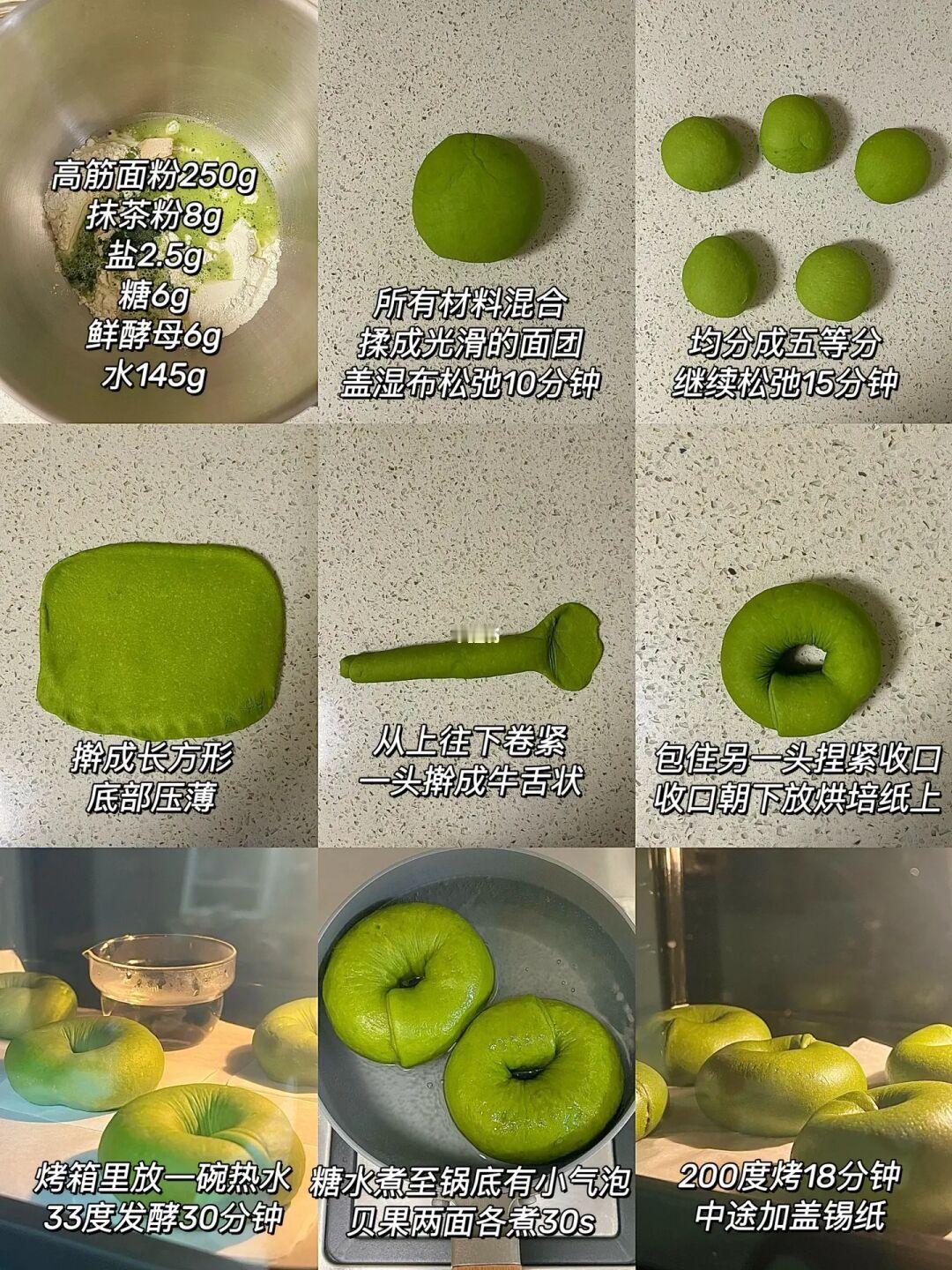 昨晚烤了几个抹茶贝果🌿尊嘟很喜欢贝果!自己烤低糖无油就是干干净净的碳水✌🏻而且越嚼越香~