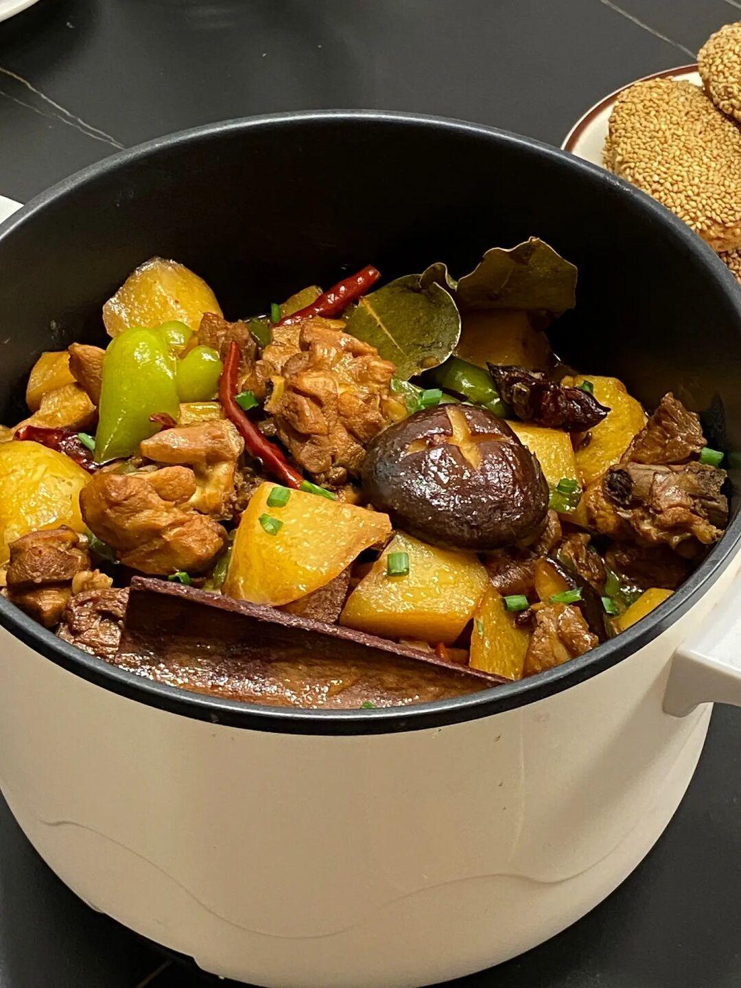 4⃣️炖煮15分钟后加入土豆、辣椒、香菇,继续炖煮15分钟