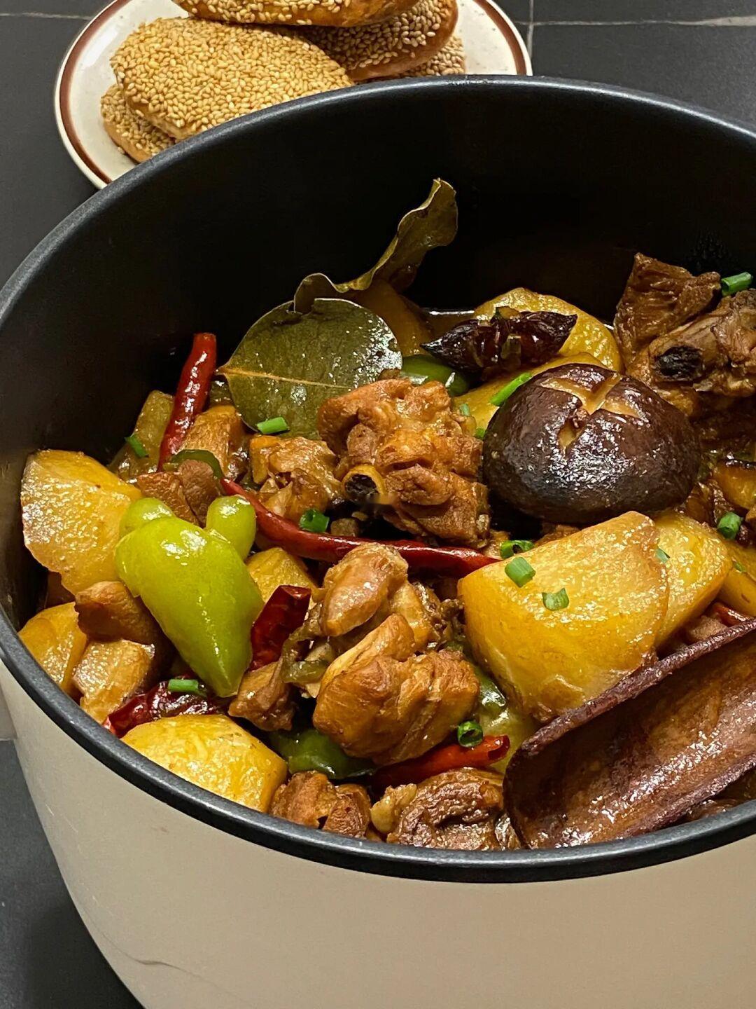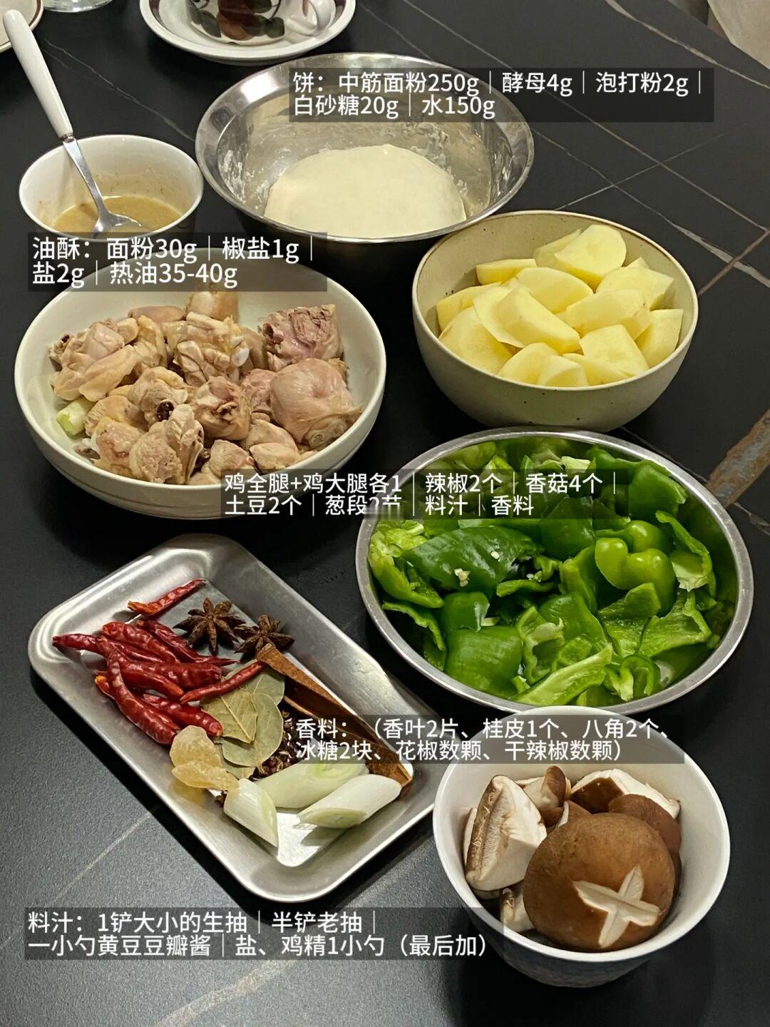 鸡全腿+鸡大腿各1|辣椒2个|香菇4个|土豆2个|葱段2节|料汁|香料