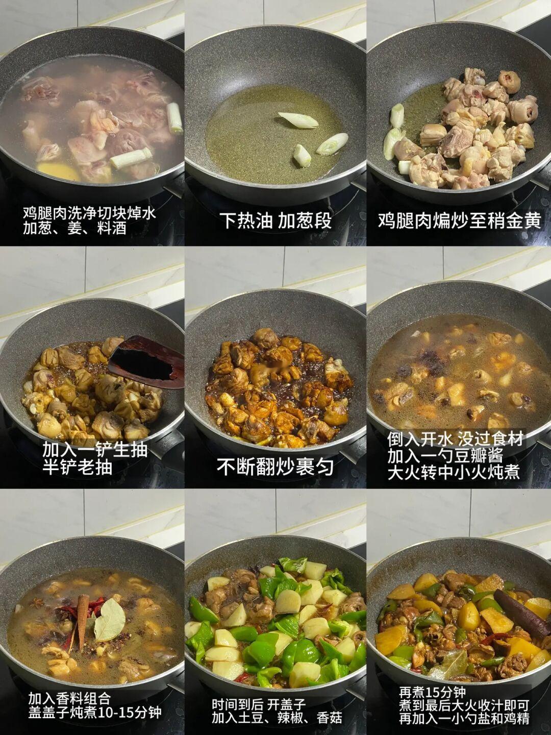 3⃣️先锅中下油加葱段和鸡腿肉煸成金黄,再加生抽、老抽,倒入开水没过食材后,转小火,加入豆瓣酱和香料