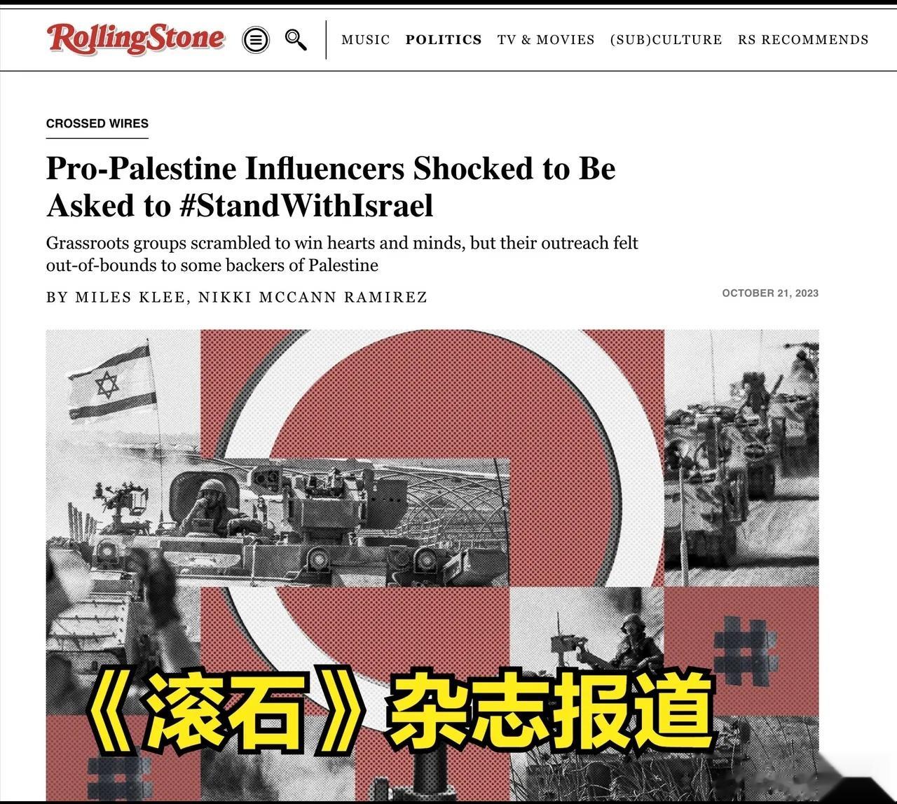对此,以色列非常希望扭转这一现象,它试图收买一部分网红,让他们尽可能发布对以色列有益的内容。比如一名支持巴勒斯坦的TikTok网红收到5000美元邀请,要求他向自己300 万粉丝发布有利于以色列的视频,但却遭到严词拒绝,不仅拒绝,还将此事公布于众!著名文化类杂志《滚石》报道了这件事,这让以色列的形象更加难堪。