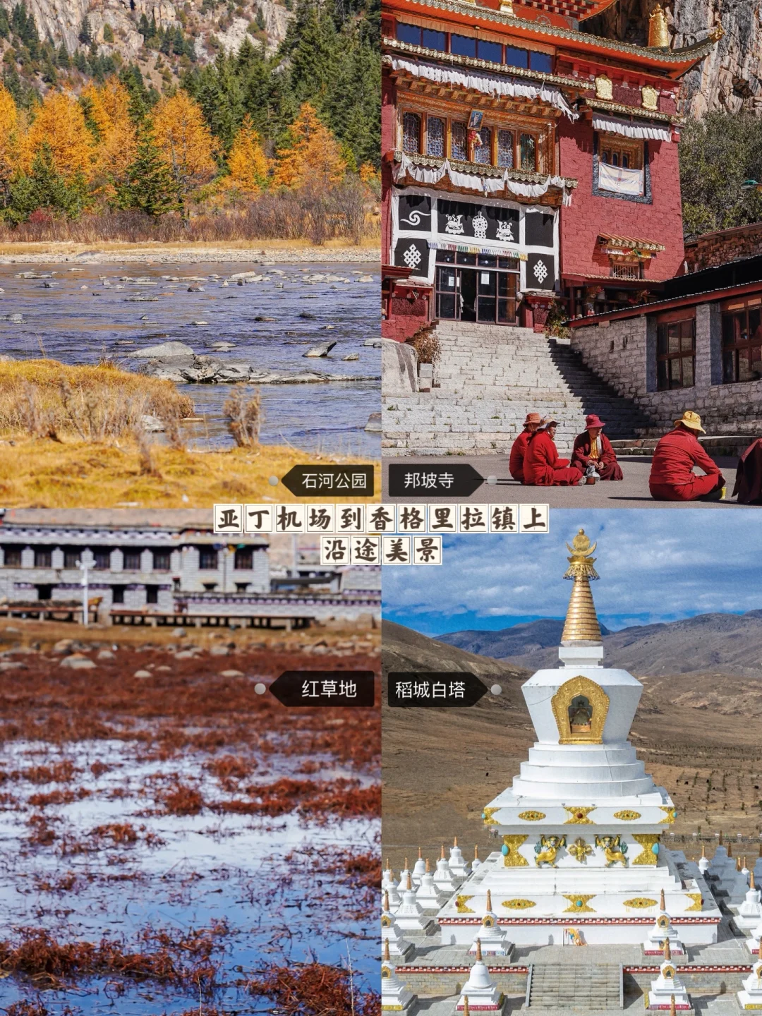 🚩一路上依次会经过:📍石河公园📍邦坡寺📍红草地📍稻城白塔,最后抵达距离亚丁景区10分钟车程的📍香格里拉镇,次日去亚丁景区