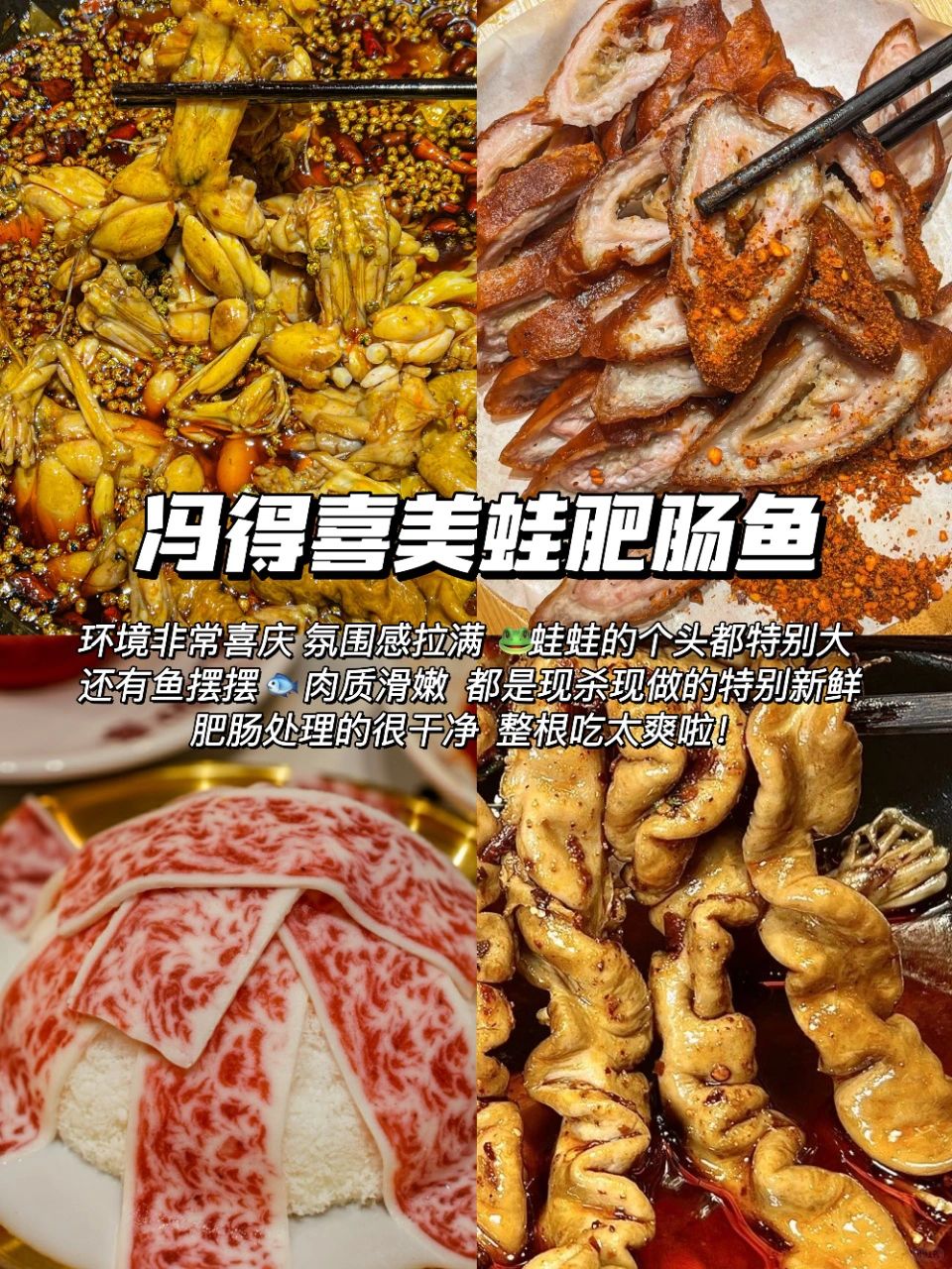 ❣️冯得喜美蛙肥肠鱼:喜欢吃牛蛙的姐妹可以去试一下,环境喜庆,氛围感拉满,蛙蛙的个头特别大🐸肉质滑嫩!