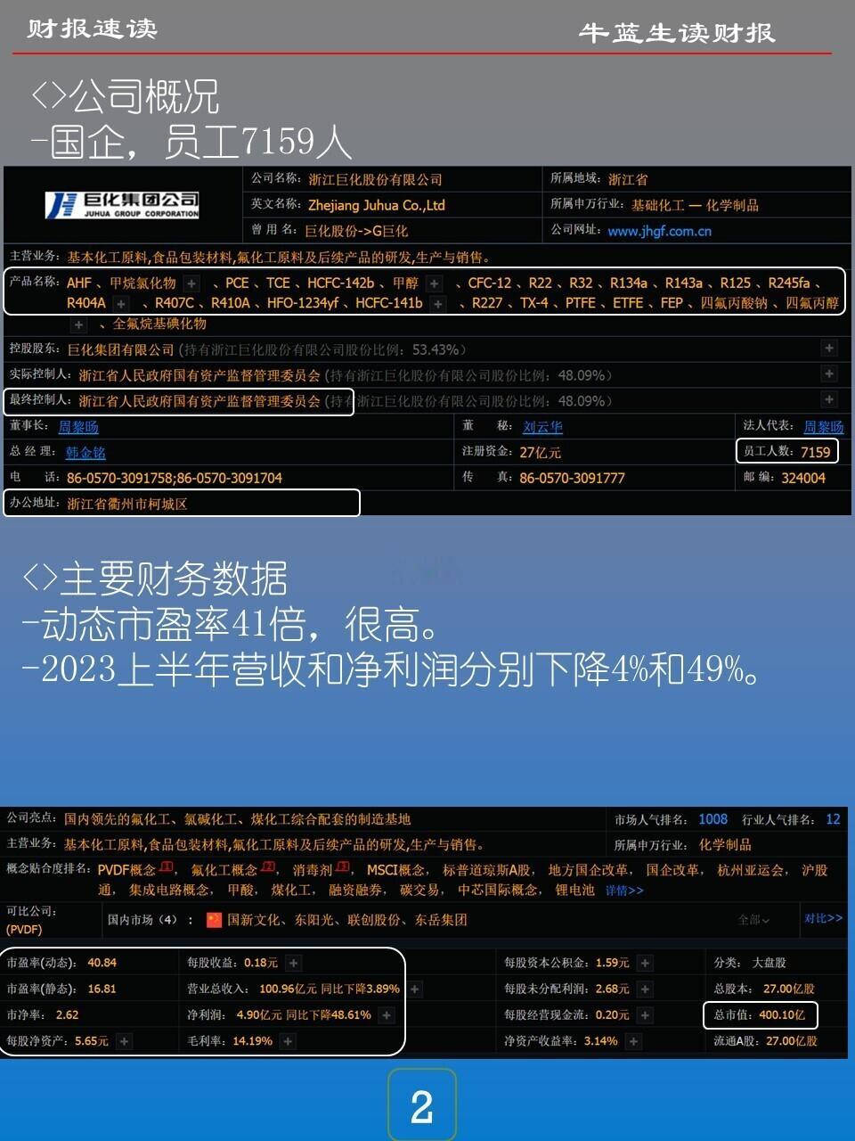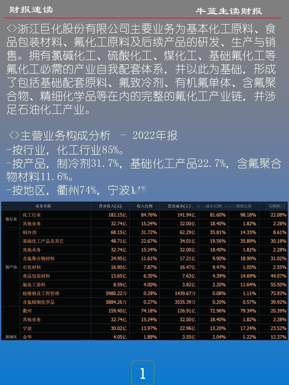 ✈浙江巨化股份有限公司主要业务为基本化工原料、食品包装材料、氟化工原料及后续产品的研发、生产与销售。 主营业务构成分析 – 2022年报 -按行业,化工行业85%。 -按产品,制冷剂31.7%,基础化工产品22.7%,含氟聚合物材料11.6%。 -按地区,衢州74%,宁波14%。