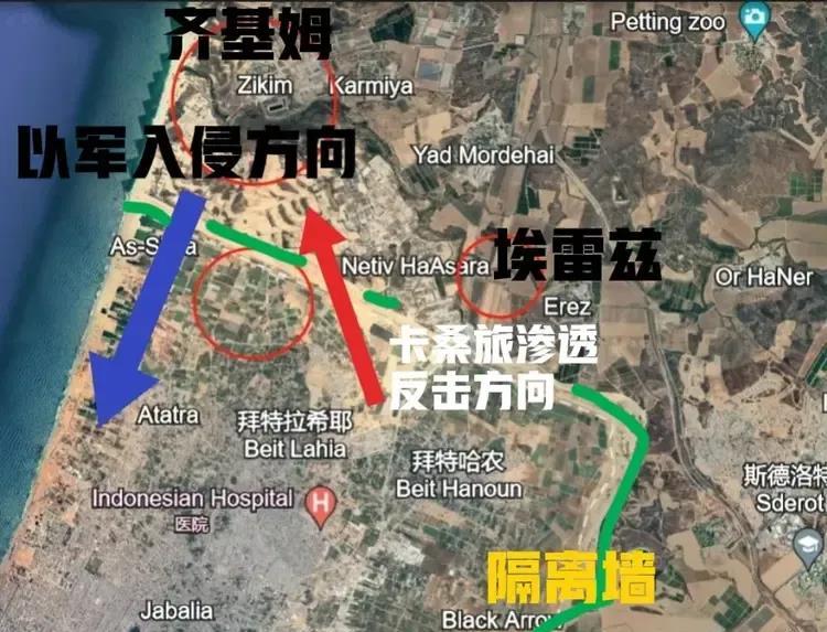 之后,“卡桑旅”声称渗透袭击了以军侧后,大致方向在埃雷兹到齐基姆之间。埃雷兹有一个大型检查站,以军重兵集结,所以要绕过隔离墙,最可能方式还是走地道。以色列军方电台证实这一消息,其称有巴勒斯坦武装通过地道,出现在了隔离墙以北数百米。之后交战持续,巴方集中火力分割以军,阻止以军策应海岸线方向的攻势。