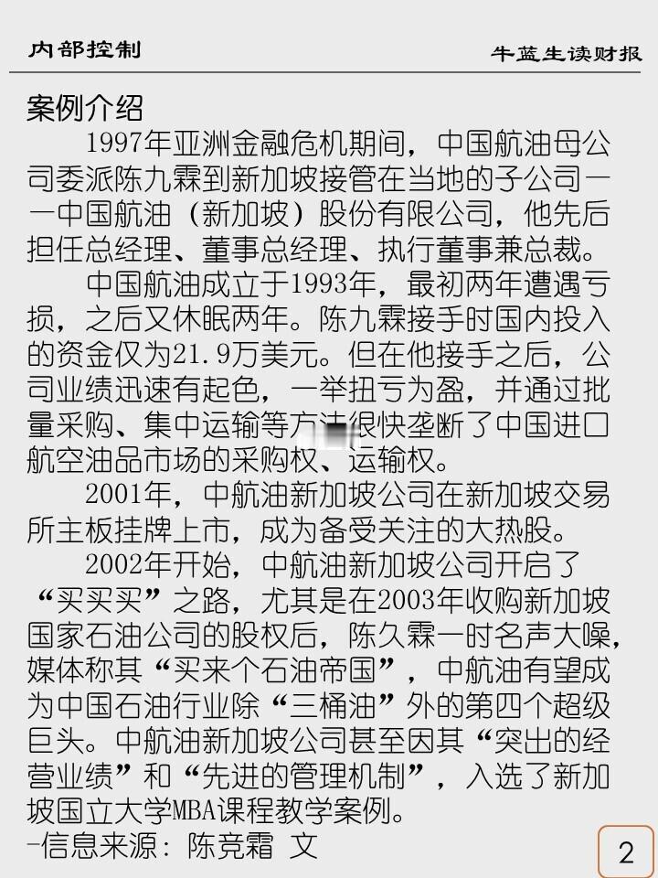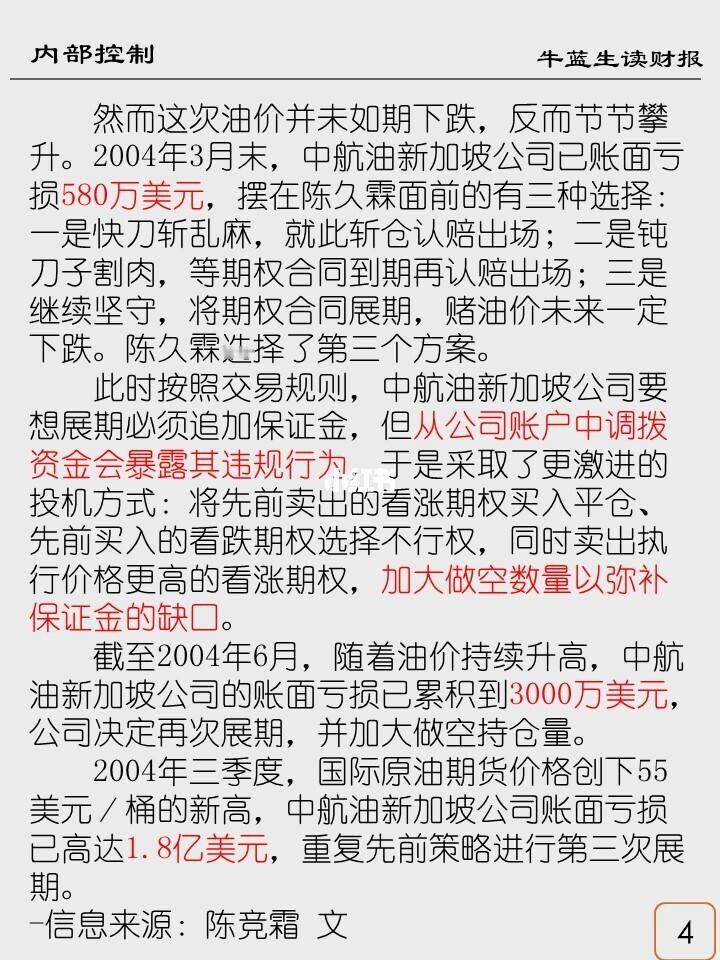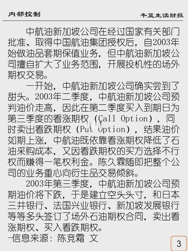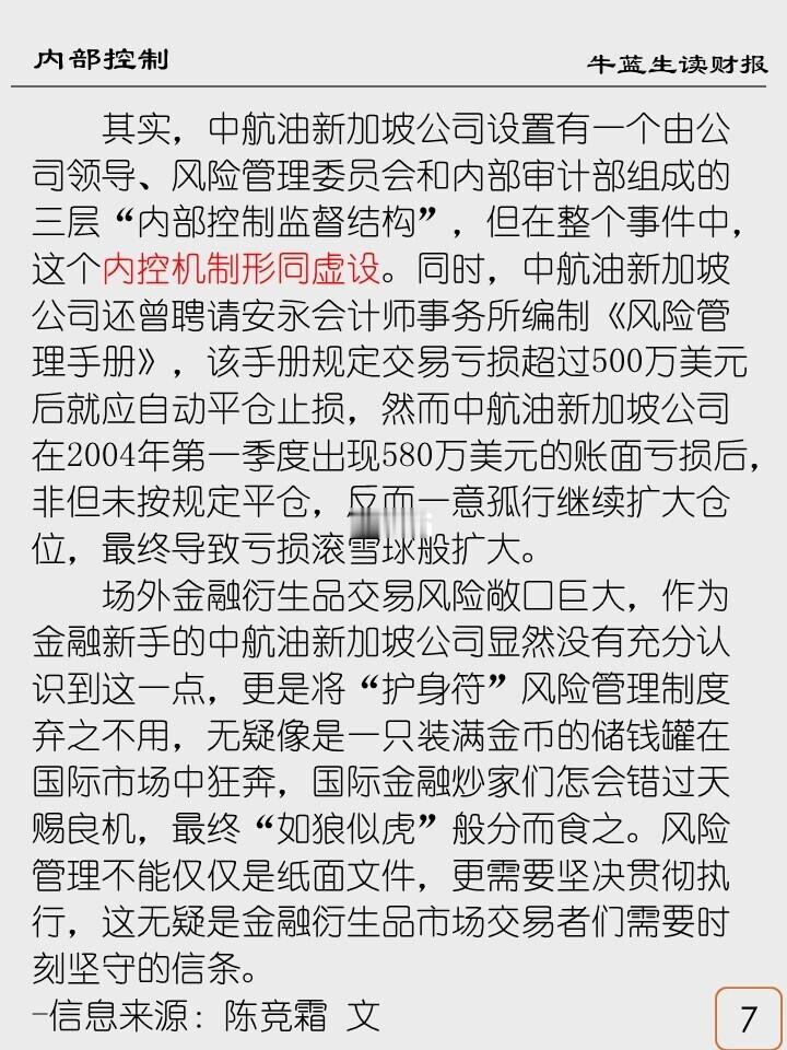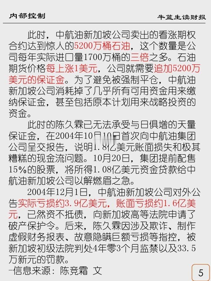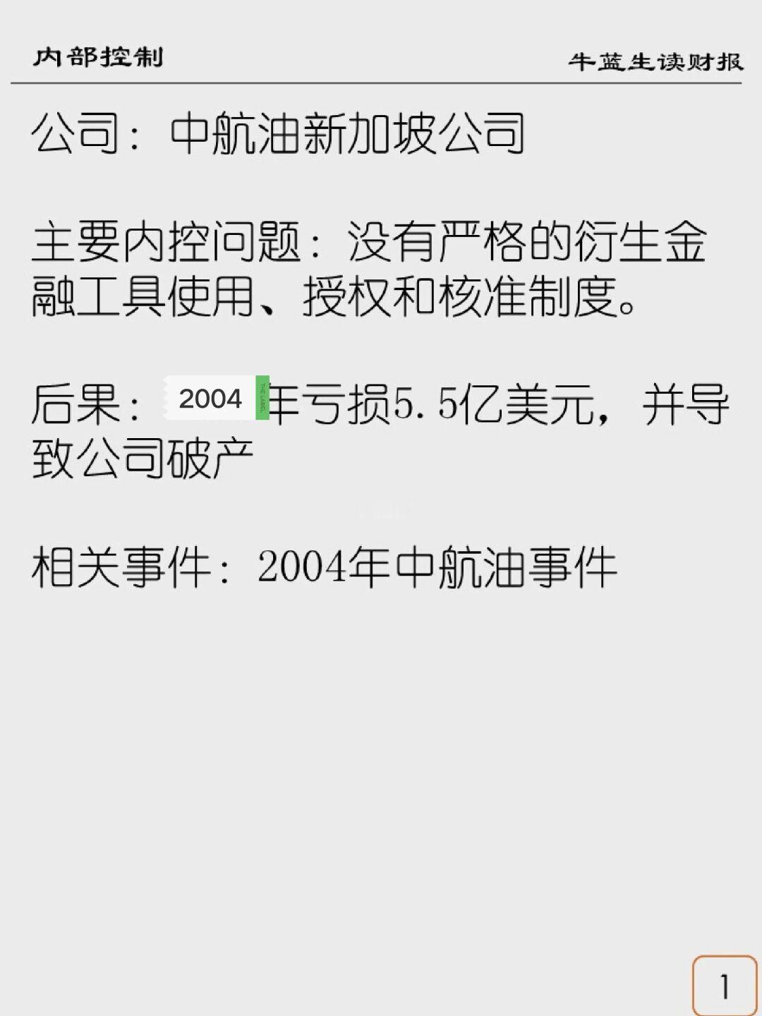 ✈主要内控问题:没有严格的衍生金融工具使用、授权和核准制度。 后果:2004年亏损5.5亿美元,并导致公司破产 相关事件:2004年中航油事件