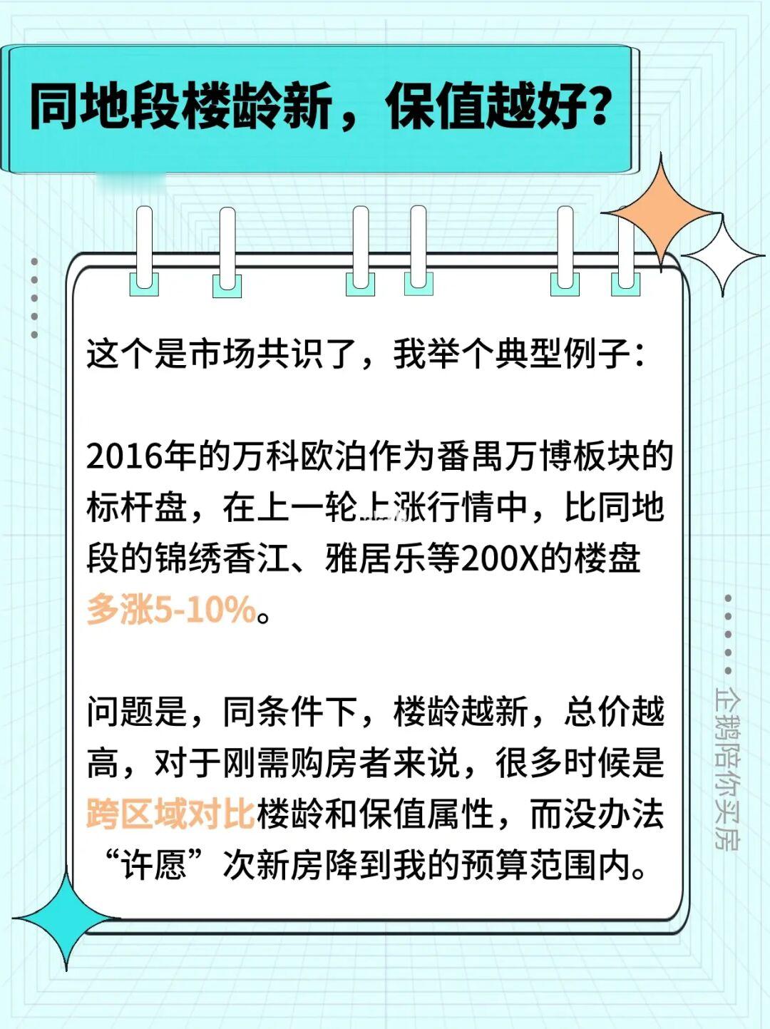 这个是市场共识了,我举个典型例子:2016年的万科欧泊作为番禺万博板块的标杆盘,在上一轮上涨行情中,比同地段的锦绣香江、雅居乐等200X的楼盘,多涨5-10%。问题是,同条件下,楼龄越新,总价越高,对于刚需购房者来说,很多时候是跨区域对比楼龄和保值属性,而没办法“许愿”次新房降到我的预算范围内。ㅤ