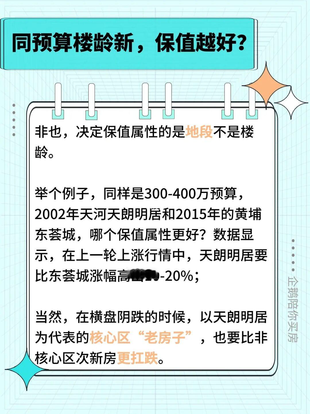 非也,决定保值属性的是地段不是楼龄。举个例子,同样是300-400万预算,2002年天河天朗明居和2015年的黄埔东荟城,哪个保值属性更好?数据显示,在上一轮上涨行情中,天朗明居要比东荟城涨幅高出10-20%;当然,在横盘阴跌的时候,以天朗明居为代表的核心区“老房子”,也要比非核心区次新房更扛跌。ㅤ