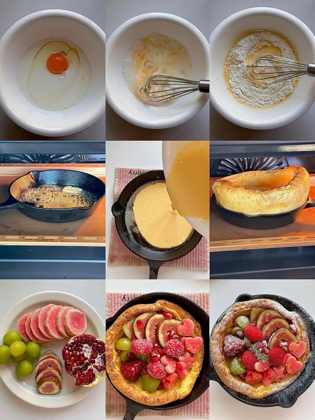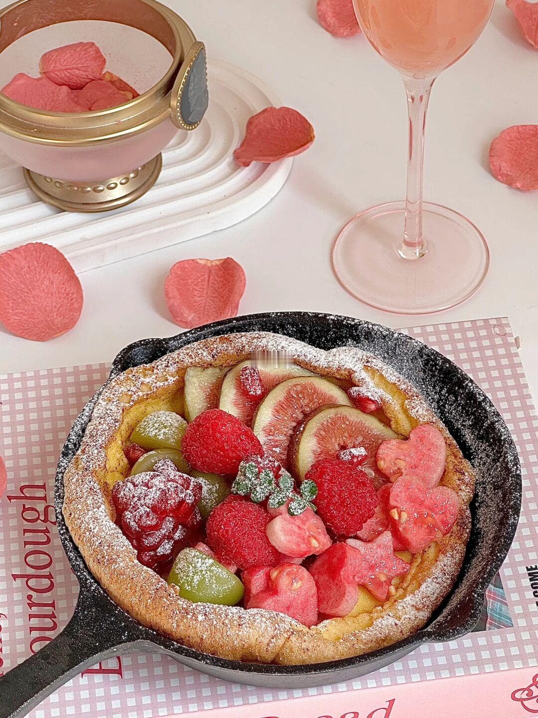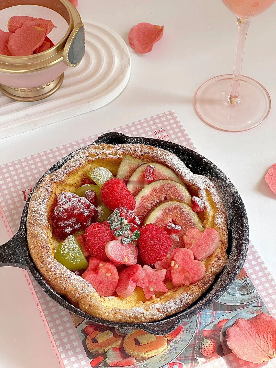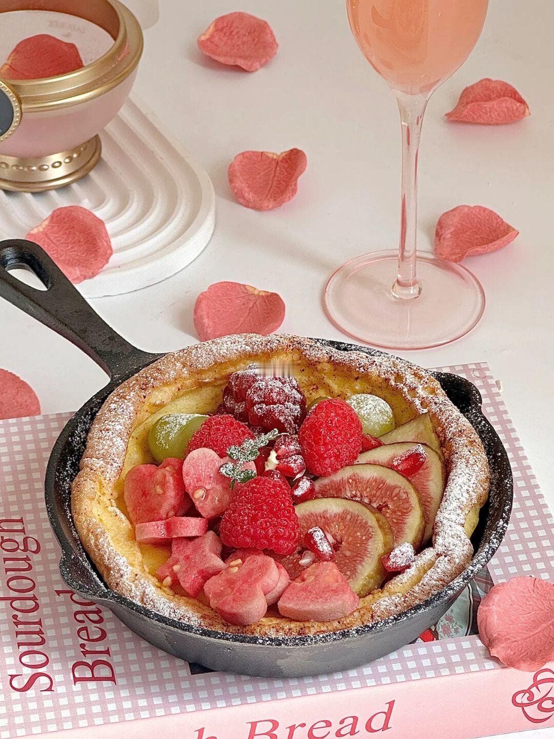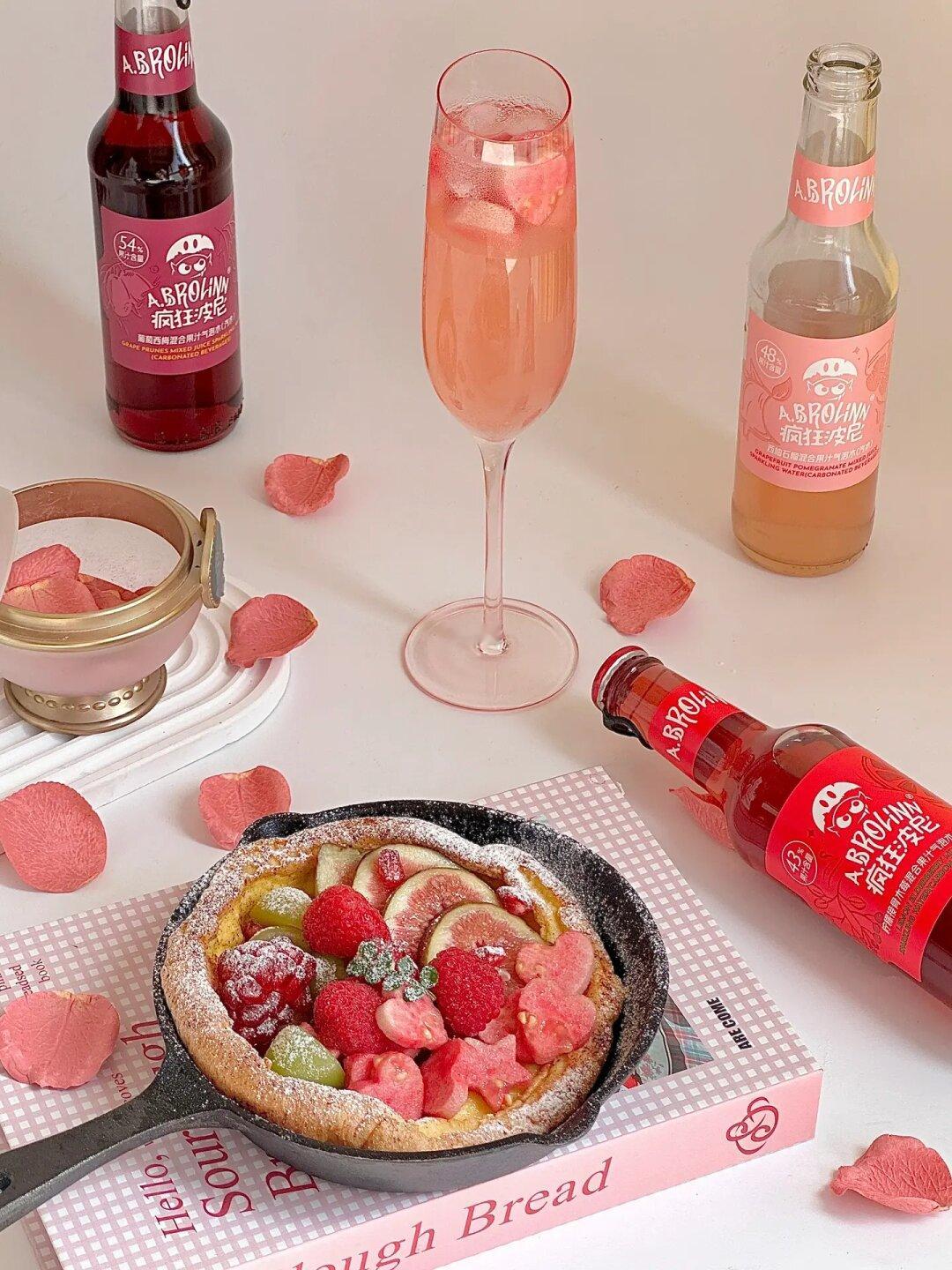 今日份早餐是💗💗💗超多粉粉水果的甜口荷兰松饼&粉粉的西柚石榴气泡水🫧