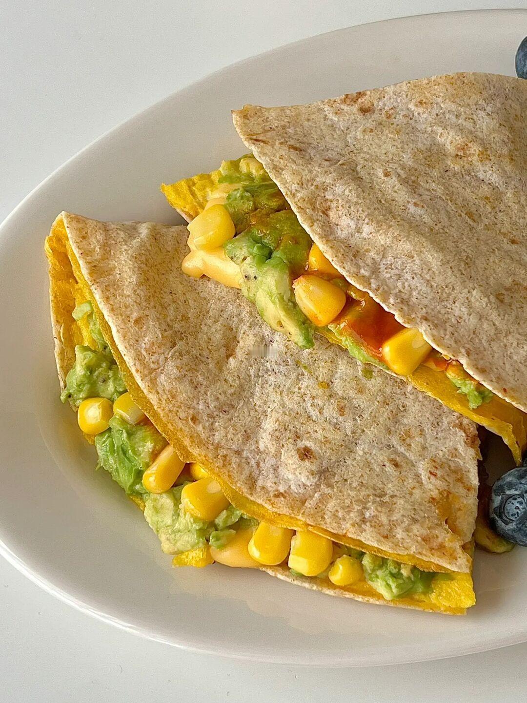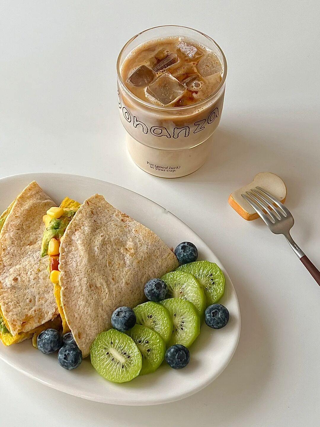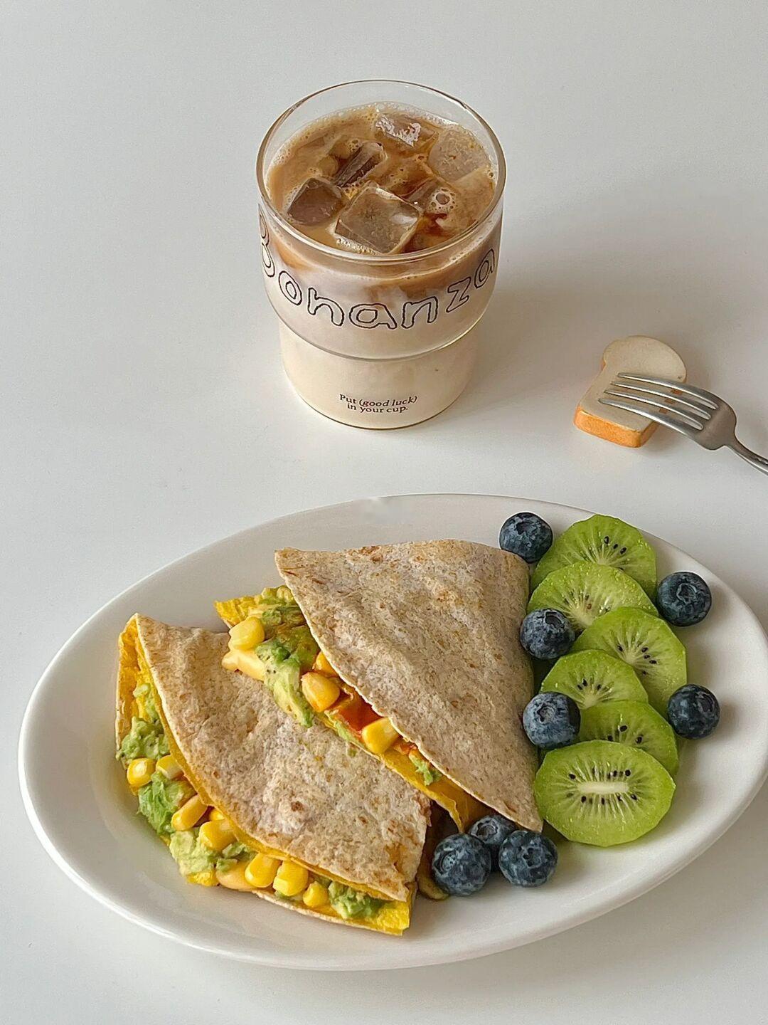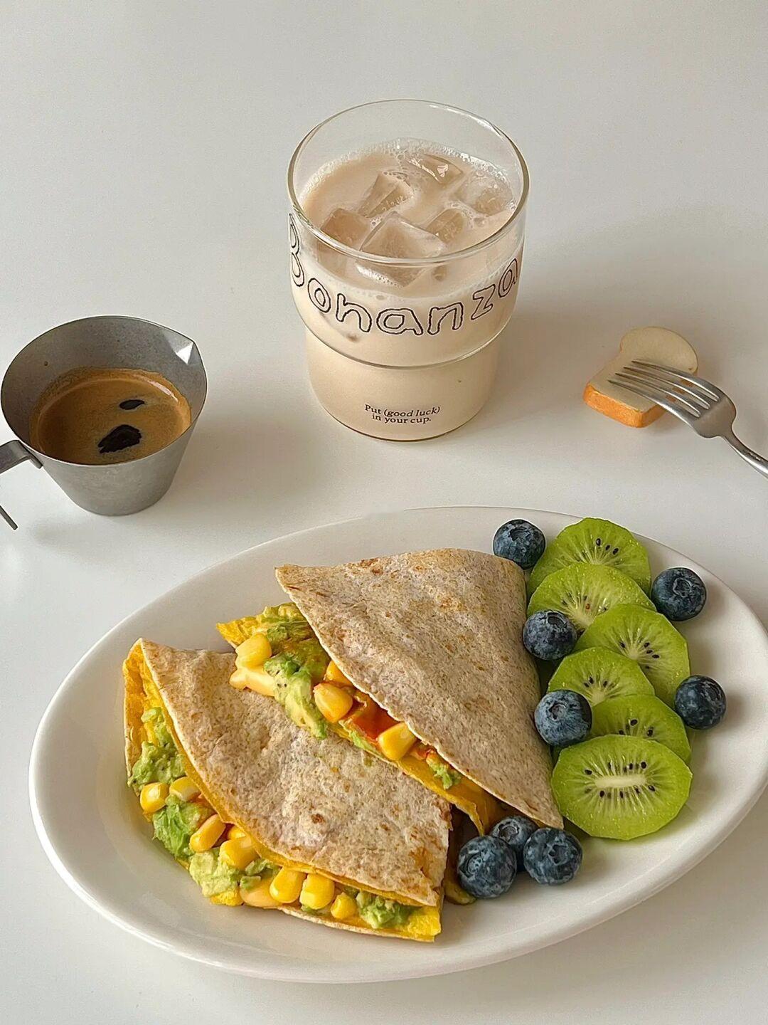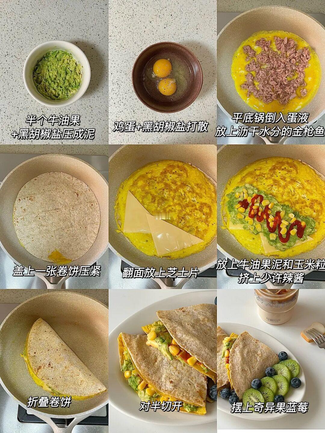 简单快手的元气早餐☀️百吃不腻的搭配😋 - 1️⃣半个牛油果+黑胡椒盐压成泥,水浸金枪鱼沥干水分,两个鸡蛋+黑胡椒盐打散 2️⃣平底锅喷油倒入蛋液放上金枪鱼,蛋液表面微微凝固后盖上一张全麦卷饼轻轻压紧,蛋饼熟了后借助盘子翻面 3️⃣放上对半切开的芝士片、牛油果泥和玉米粒,挤上少许辣酱,折叠蛋饼对半切开即可 4️⃣摆盘放上一点猕猴桃和蓝莓,喝的是燕麦拿铁 -