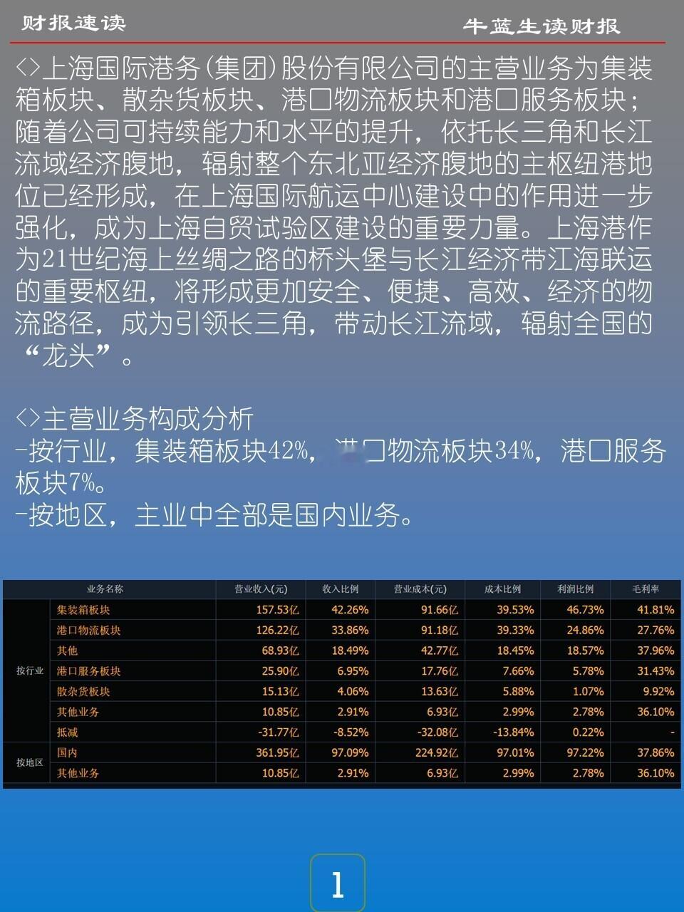 ✈上海国际港务(集团)股份有限公司的主营业务为集装箱板块、散杂货板块、港口物流板块和港口服务板块;随着公司可持续能力和水平的提升,依托长三角和长江流域经济腹地,辐射整个东北亚经济腹地的主枢纽港地位已经形成,在上海国际航运中心建设中的作用进一步强化,成为上海自贸试验区建设的重要力量。上海港作为21世纪海上丝绸之路的桥头堡与长江经济带江海联运的重要枢纽,将形成更加安全、便捷、高效、经济的物流路径,成为引领长三角,带动长江流域,辐射全国的“龙头”。