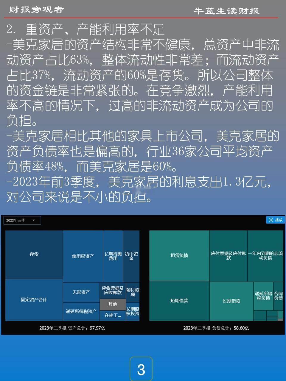 -美克家居的资产结构非常不健康,总资产中非流动资产占比63%,整体流动性非常差;而流动资产占比37%,流动资产的60%是存货。所以公司整体的资金链是非常紧张的。在竞争激烈,产能利用率不高的情况下,过高的非流动资产成为公司的负担。