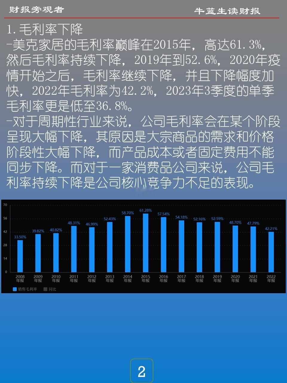 -美克家居的毛利率巅峰在2015年,高达61.3%,然后毛利率持续下降,2019年到52.6%,2020年疫情开始之后,毛利率继续下降,并且下降幅度加快,2022年毛利率为42.2%,2023年3季度的单季毛利率更是低至36.8%。