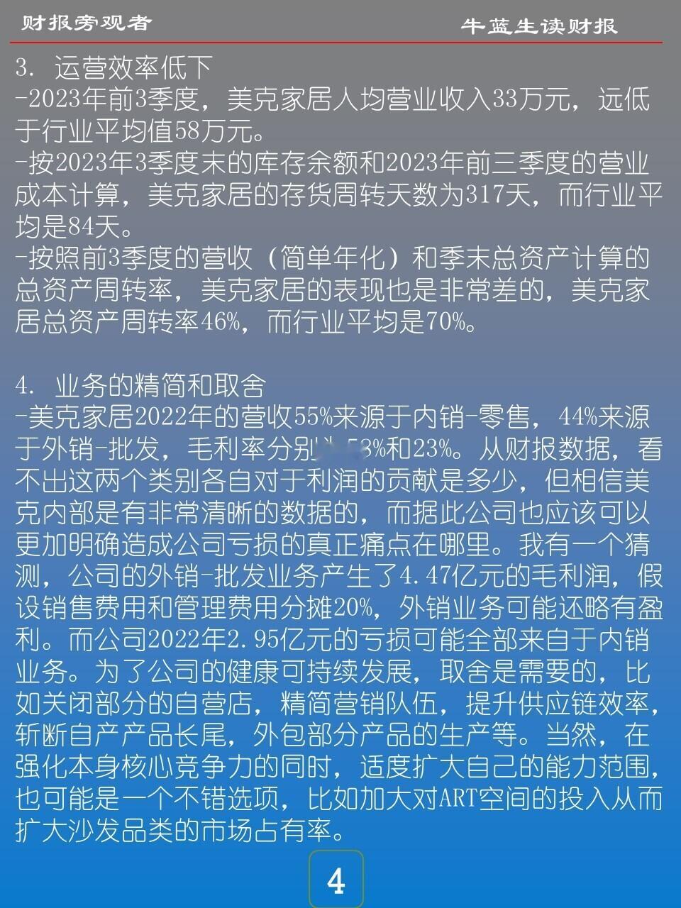 -按2023年3季度末的库存余额和2023年前三季度的营业成本计算,美克家居的存货周转天数为317天,而行业平均是84天。