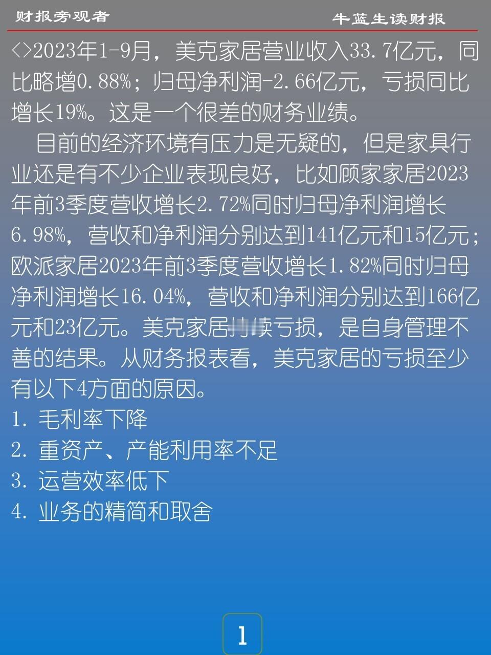 目前的经济环境有压力是无疑的,但是家具行业还是有不少企业表现良好,比如顾家家居2023年前3季度营收增长2.72%同时归母净利润增长6.98%,营收和净利润分别达到141亿元和15亿元;欧派家居2023年前3季度营收增长1.82%同时归母净利润增长16.04%,营收和净利润分别达到166亿元和23亿元。美克家居持续亏损,是自身管理不善的结果。从财务报表看,美克家居的亏损至少有以下4方面的原因。