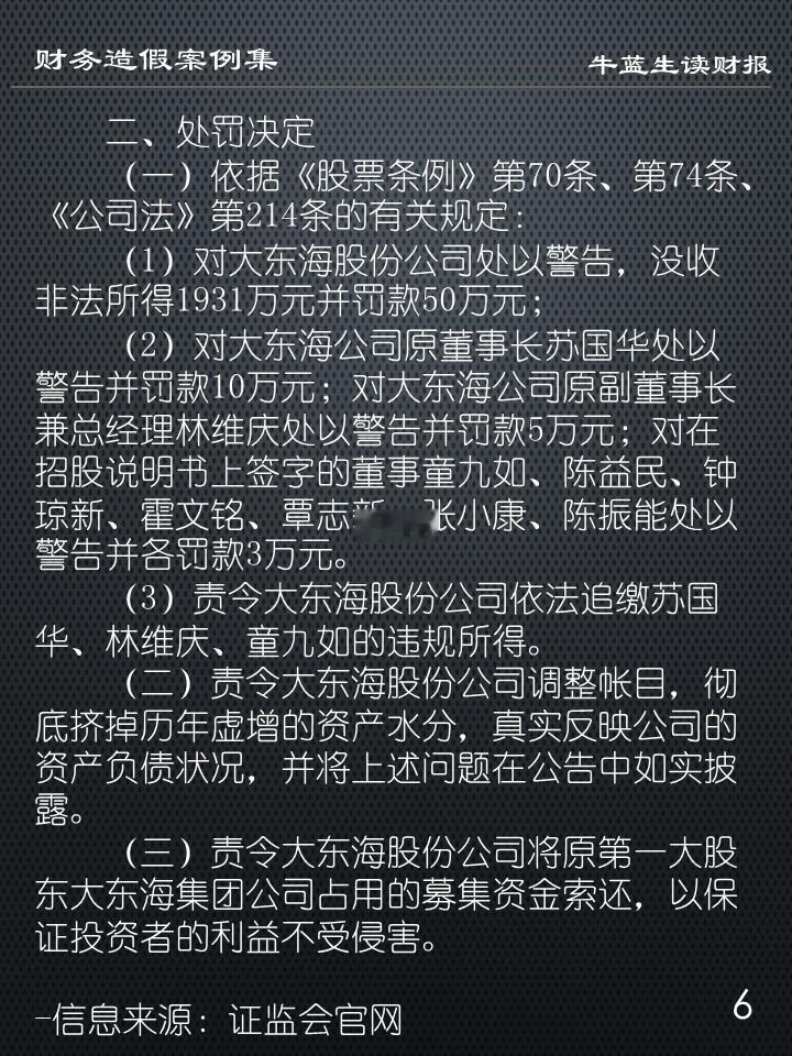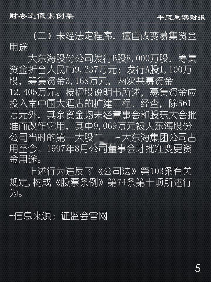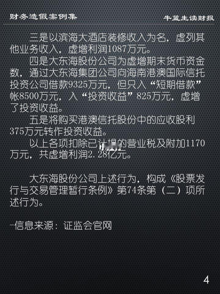 四是大东海股份公司为虚增期末货币资金数,通过大东海集团公司向海南港澳国际信托投资公司借款9325万元,但只入“短期借款”帐8500万元,入“投资收益”825万元,虚增了投资收益。