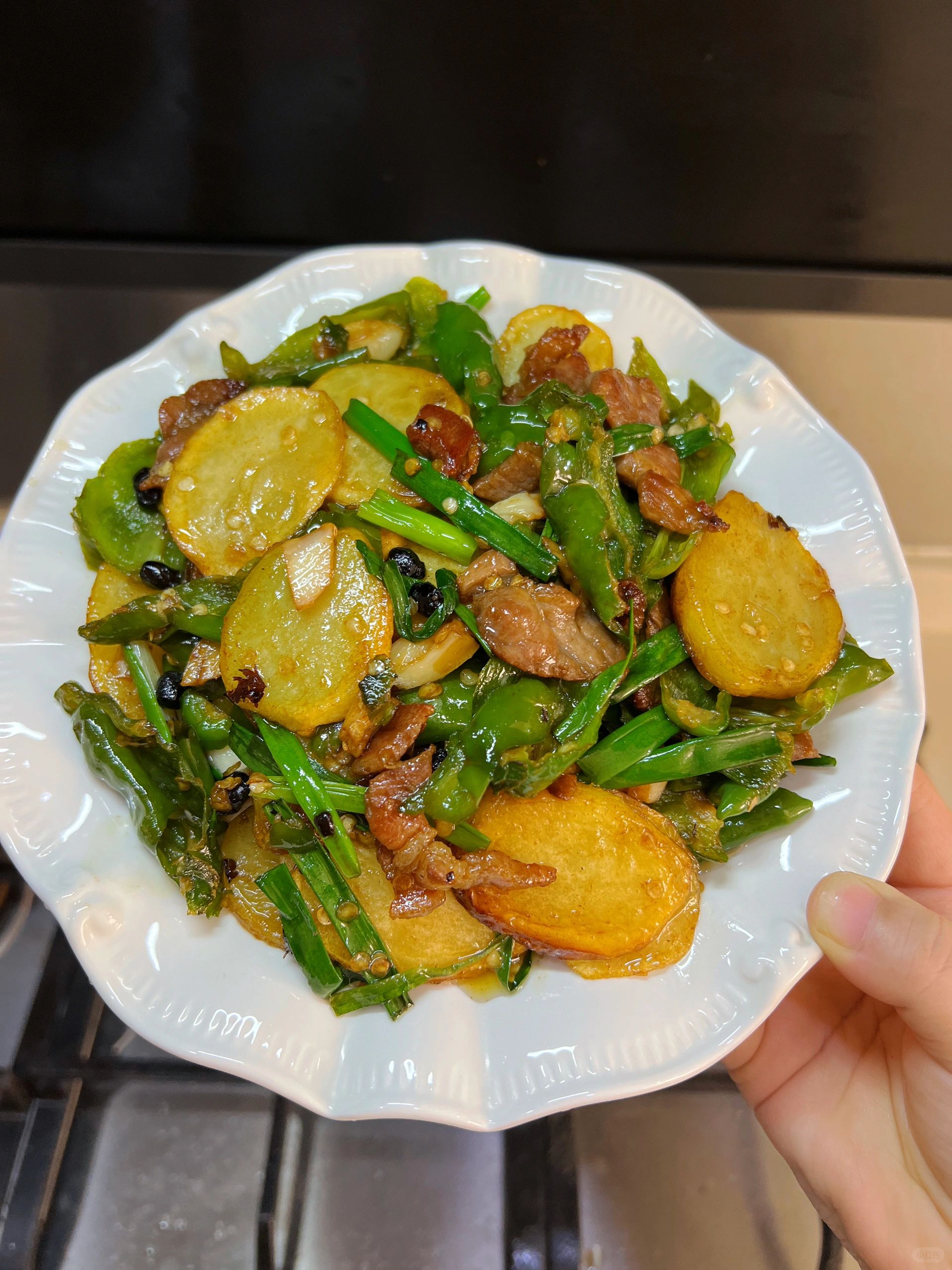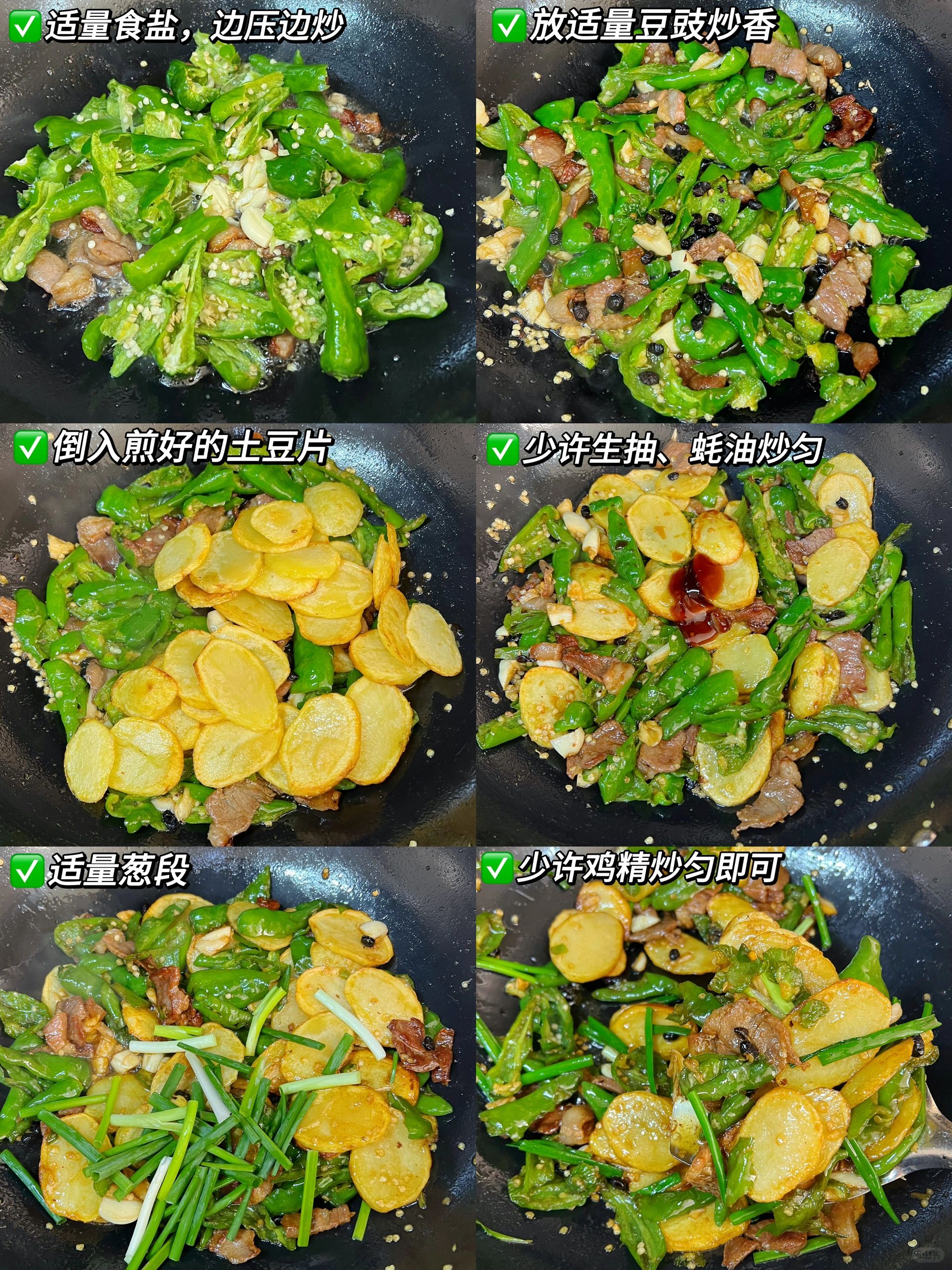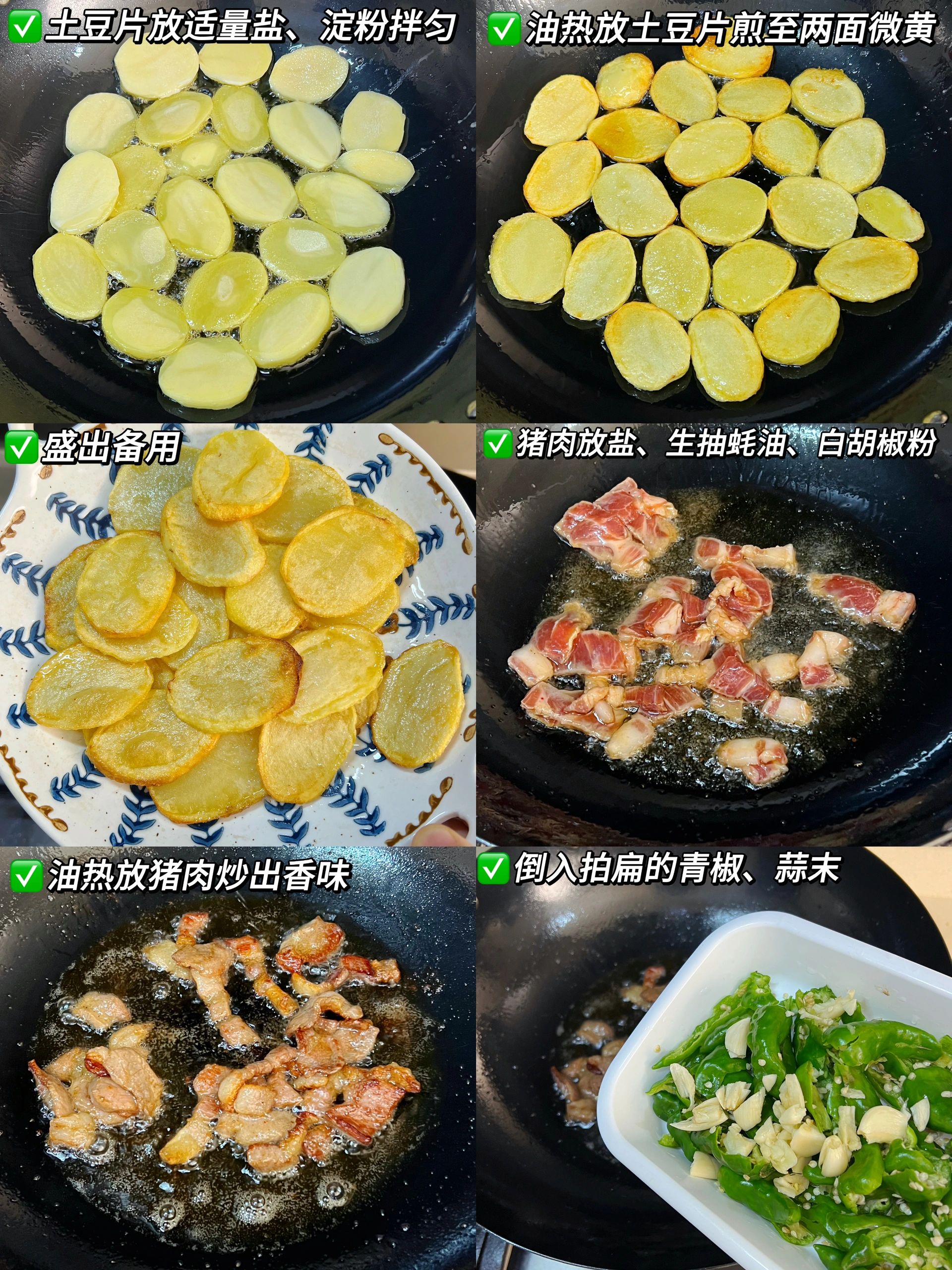 别问为什么又是土豆,问就是我爱吃[偷笑R][偷笑R][偷笑R][偷笑R]爱吃土豆的姐妹冲冲冲,这个做法真的巨好吃 🍀食材:土豆、猪肉、蒜、葱、青椒、豆豉; 👇做法: 1、土豆切片洗下,放盐、淀粉拌匀,油热下土豆煎至两面微黄,盛出备用; 2、猪肉放盐、生抽蚝油、白胡椒粉拌匀腌制,油热下猪肉炒香,再倒入拍扁的青椒、蒜、豆豉炒香; 3、倒入土豆片、适量生抽、蚝油快速炒匀,放适量葱段、鸡精炒匀即可;