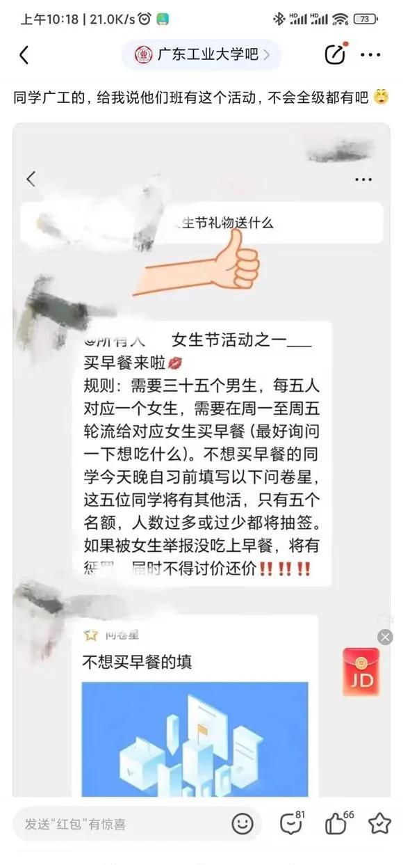 广东工业大学“女生节强制送早餐”那档子破事还有后续。 先贴一下前情提要如图2图3。 广工大一新生班委要求全班男生给女生过“女生节”,轮流给女生带早餐,持续一星期。然后有男生不愿意,但不愿意的话必须填问卷,并且还有其他活安排代替。觉得被裹挟和绑架的男生就把这事儿发到网上吐槽。