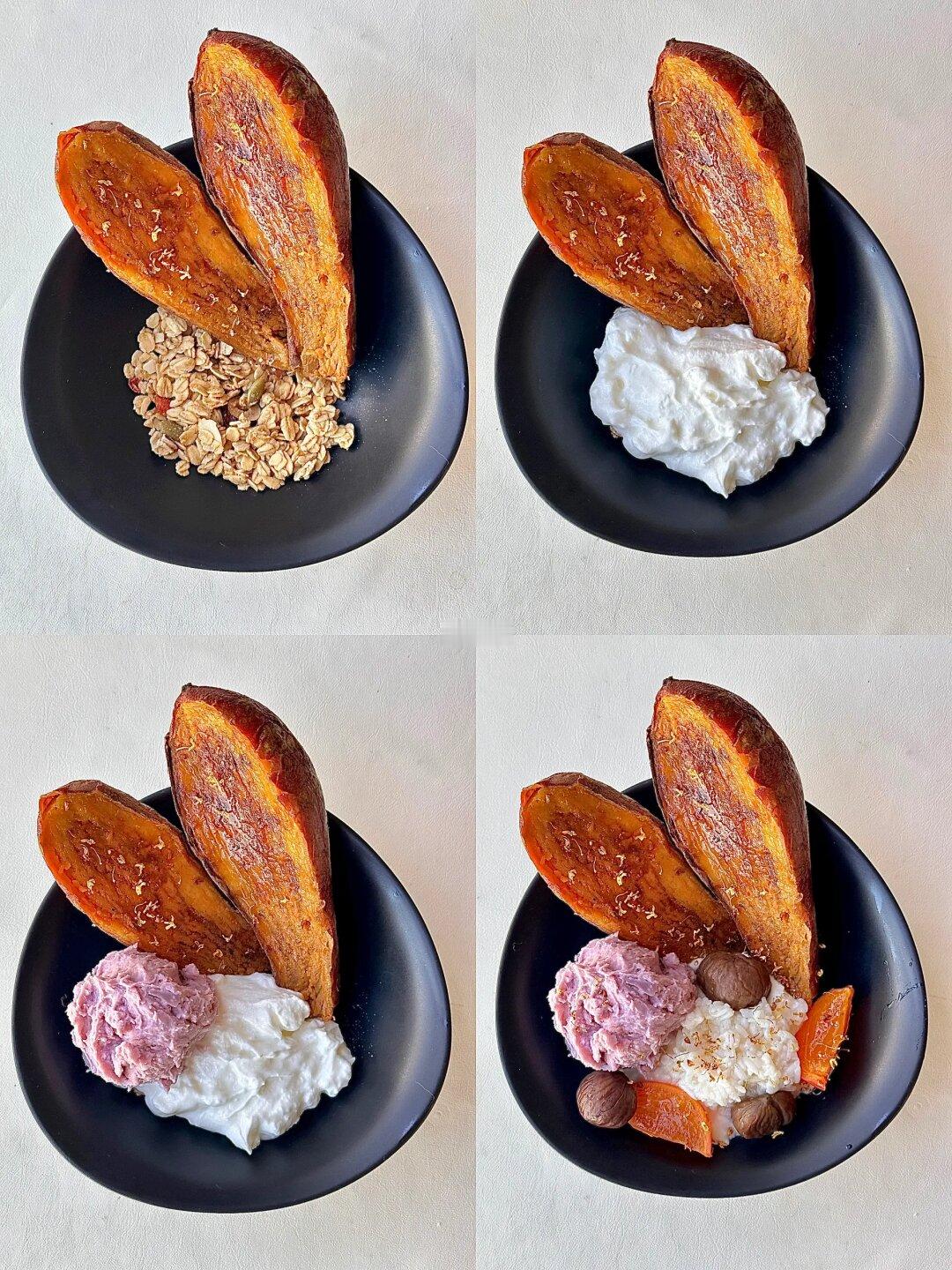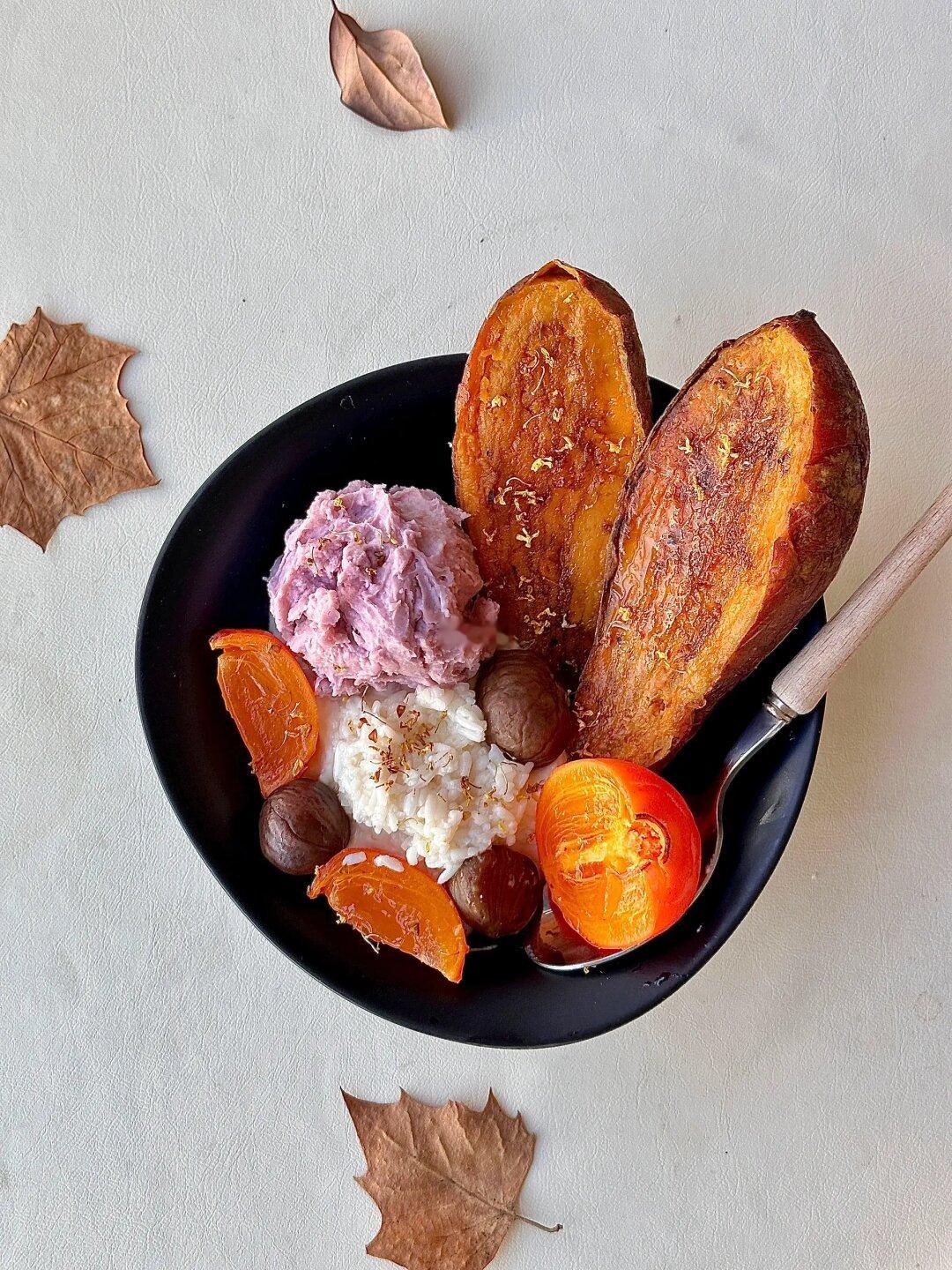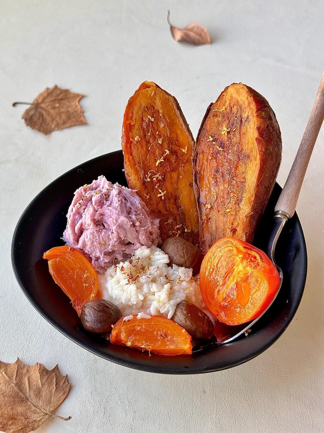今日份早餐是🍁秋意浓浓的氛围感酸奶碗哦🥣 超级无敌快手 还不用开火 我真的是5分钟就搞定了 提前一晚做好了芋泥和烤红薯【后图附做法】 🌟所需食材 烘焙燕麦 希腊酸奶 芋泥 红薯 柿子 酒酿 干桂花 做法如下⬇️【后图附步骤图】 碗里铺入烘焙燕麦 摆上红薯 抹上酸奶 摆上芋泥球和柿子 来两勺酒酿 最后撒上干桂花装饰 秋季的酸奶碗一起做起来吧