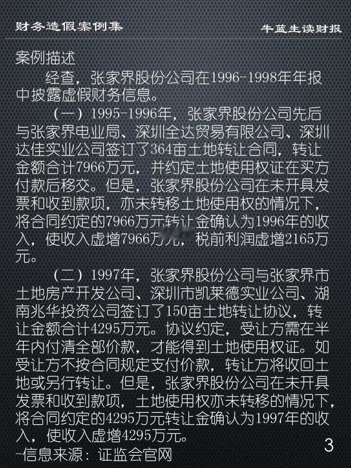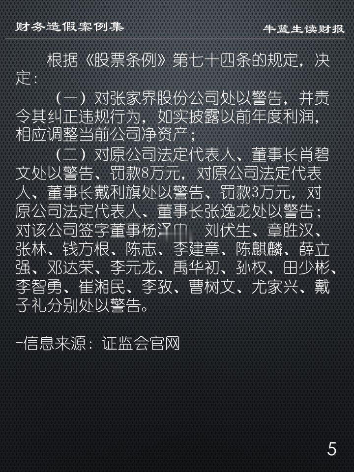 ✈在1996-1998年期间,张家界股份公司年报中共虚构收入累计12,261万元(占三年累计营业收入的49%),虚构其它业务利润528万元,虚增税前利润4662万元(占三年税前利润总额的62%)。 张家界股份公司的上述行为违反了《企业会计准则》第2章第10条“会计核算应当以实际发生的经济业务为依据,如实反映财务状况和经营成果”的规定,构成了《股票发行与交易管理暂行条例》第74条第(二)项所述“在股票发行、交易过程中,作出虚假、严重误导性陈述或者遗漏重大信息的”行为。